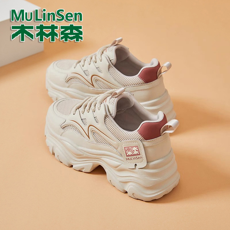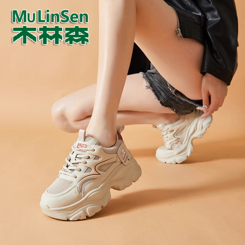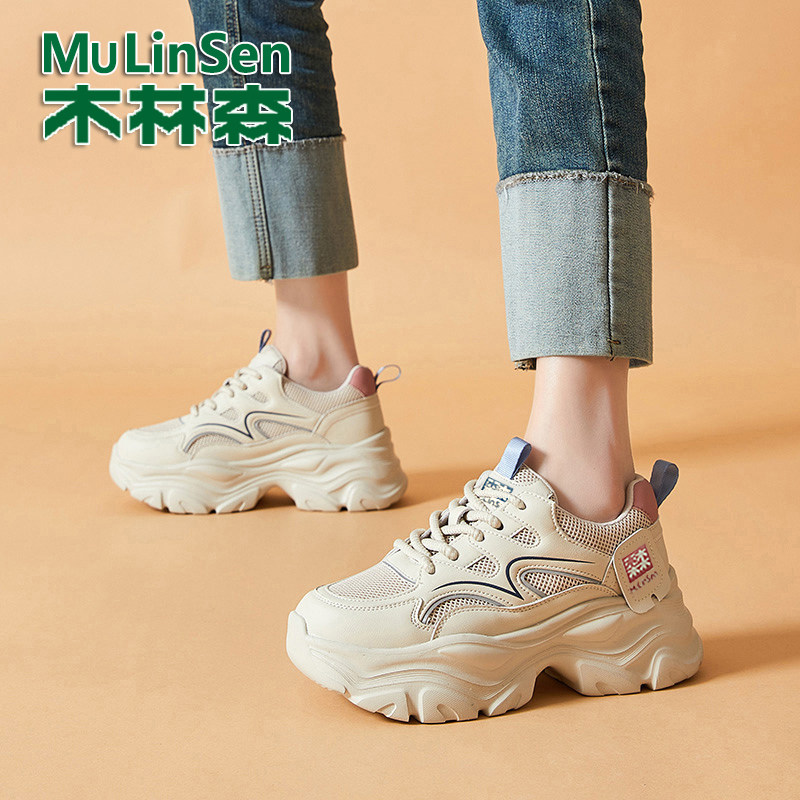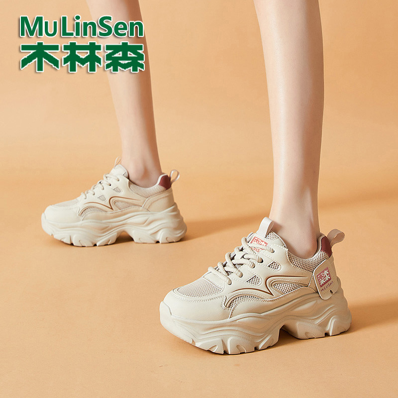 木林森女鞋真皮网面老爹鞋女2025秋季新款厚底增高百搭运动休闲鞋