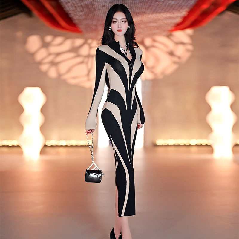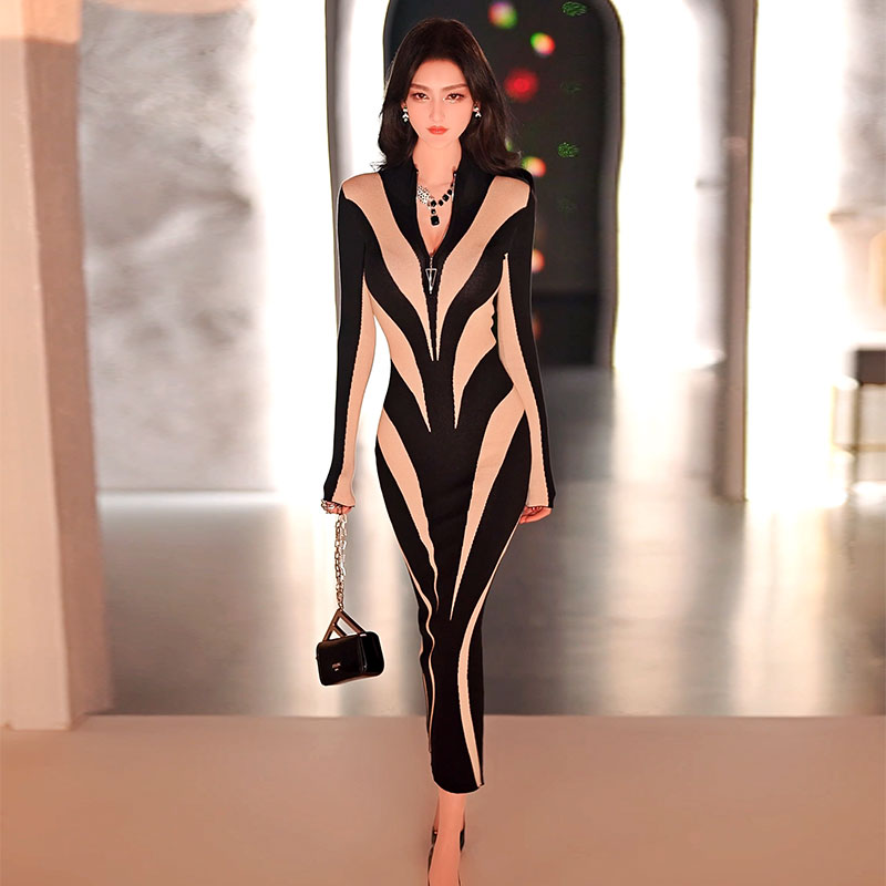 冬季欧美气质显瘦收腰针织裙新款半拉链开襟长款毛衣连衣裙