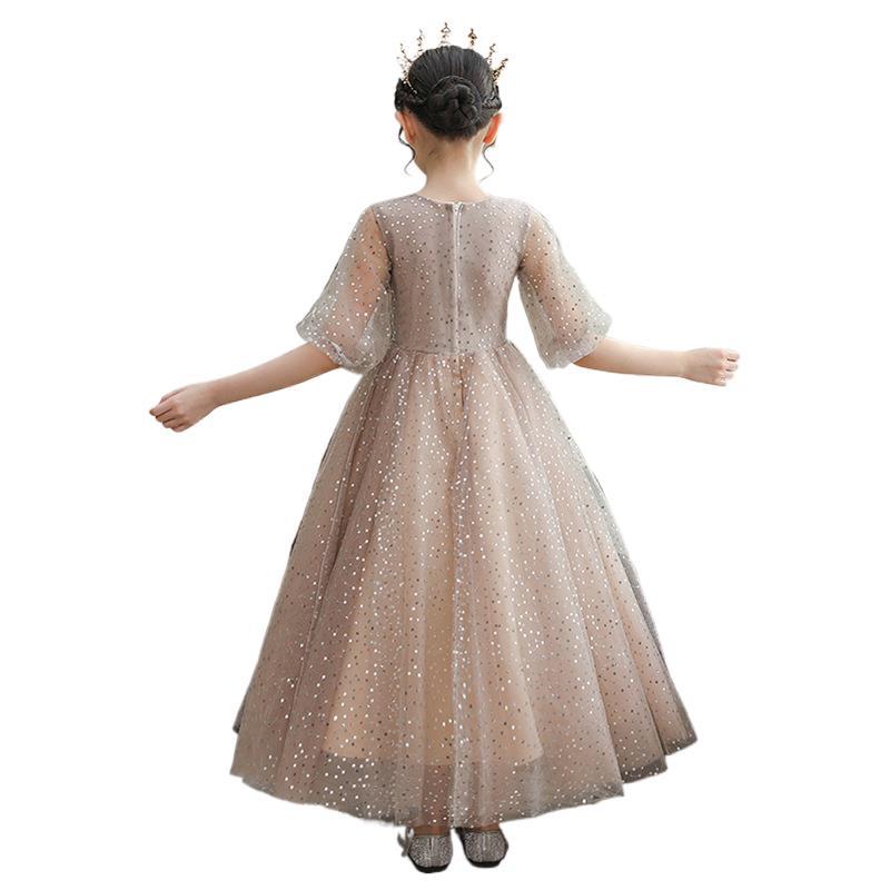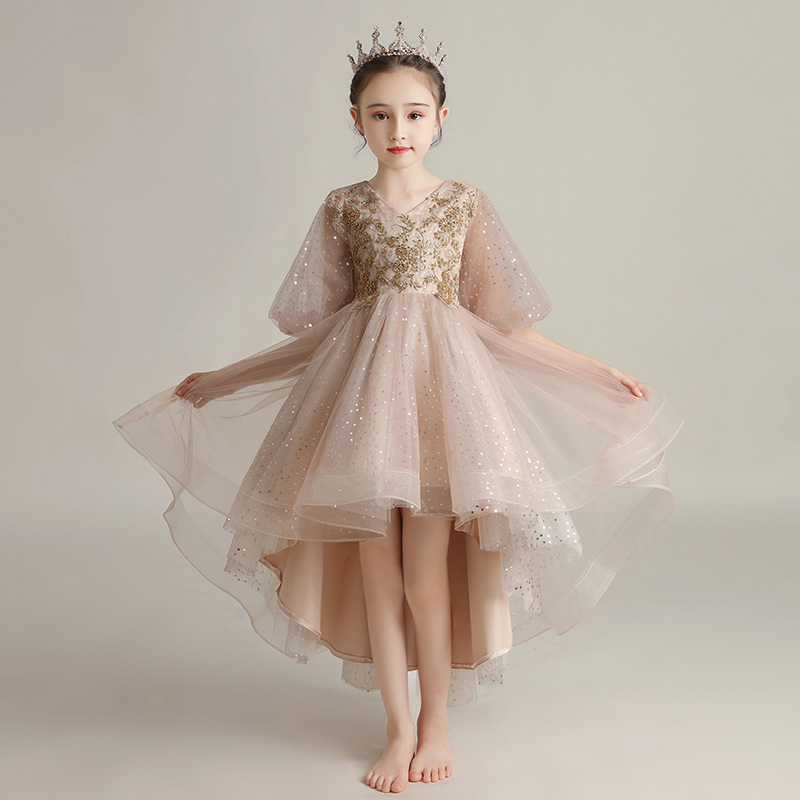 女童生日礼服金色轻奢公主长裙小女孩主持人钢琴演出服装长袖秋冬