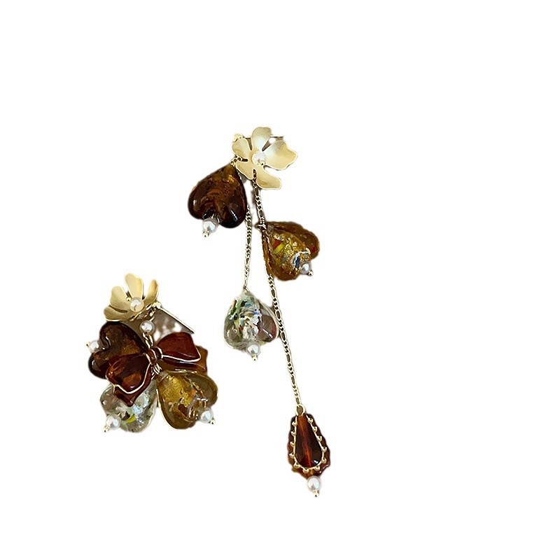 美拉德风琉璃爱心花朵流苏长款耳钉女小众设计不对称百搭耳环耳饰