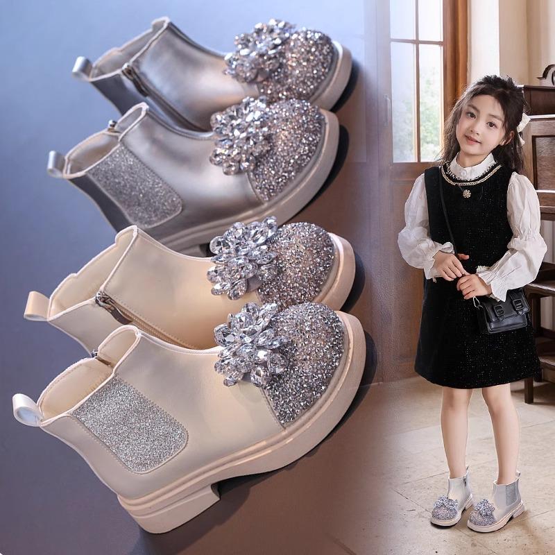 真皮女童靴子爱莎公主水晶马丁靴2025秋冬季新款儿童短靴二棉皮靴