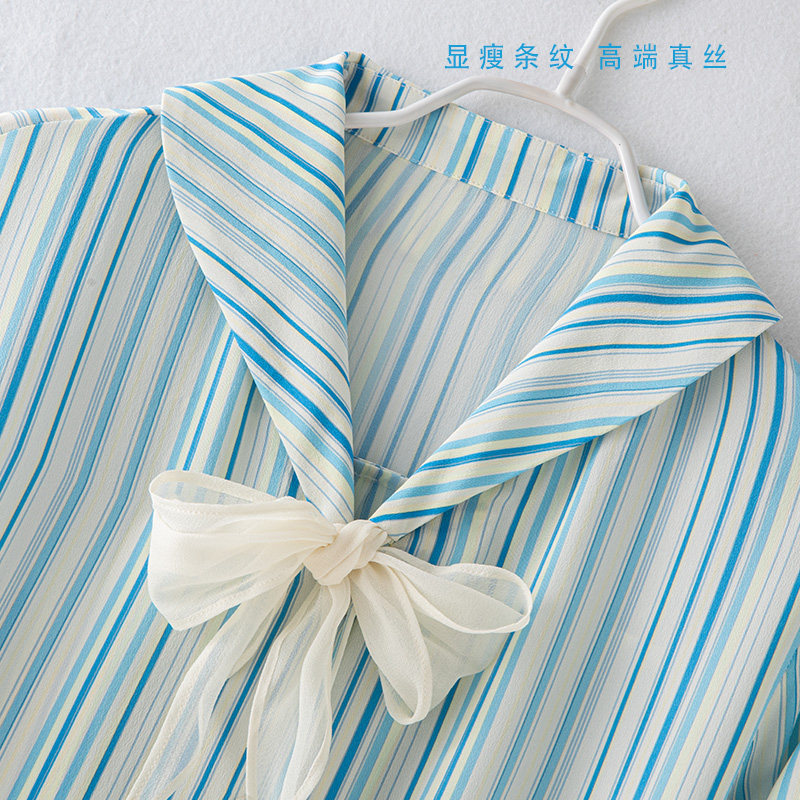 学院风条纹蝴蝶结重磅真丝衬衫女长袖2025秋设计感条纹桑蚕丝上衣