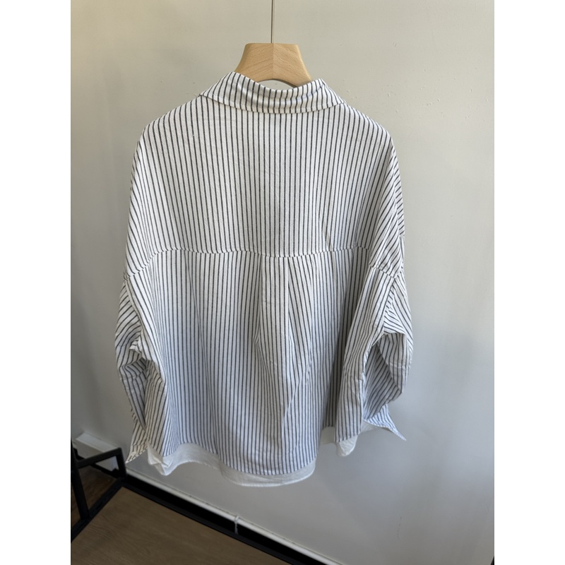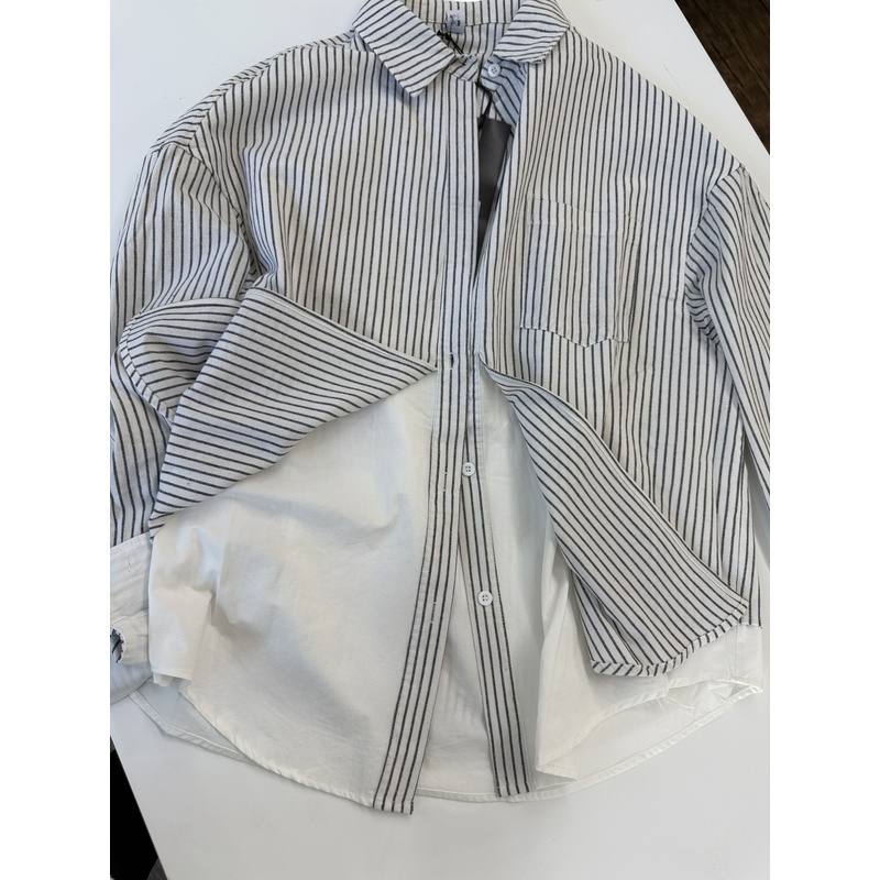 小王家女82281秋宽松大码胖mm简约休闲风时尚竖条假两件长袖衬衫