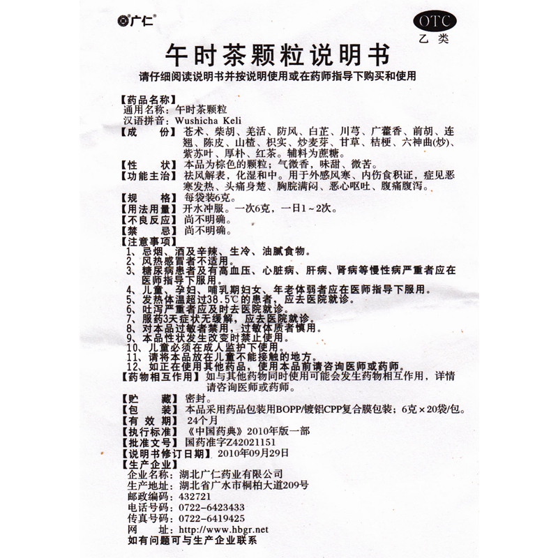 广仁 午时茶颗粒 6g*20袋/包 祛风解表化湿和中用于外感风寒