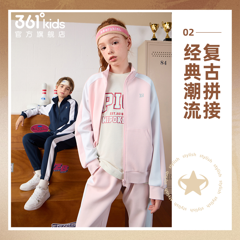 361°童装男女童针织套装2025年春秋新款撞色拼接中大童运动套装