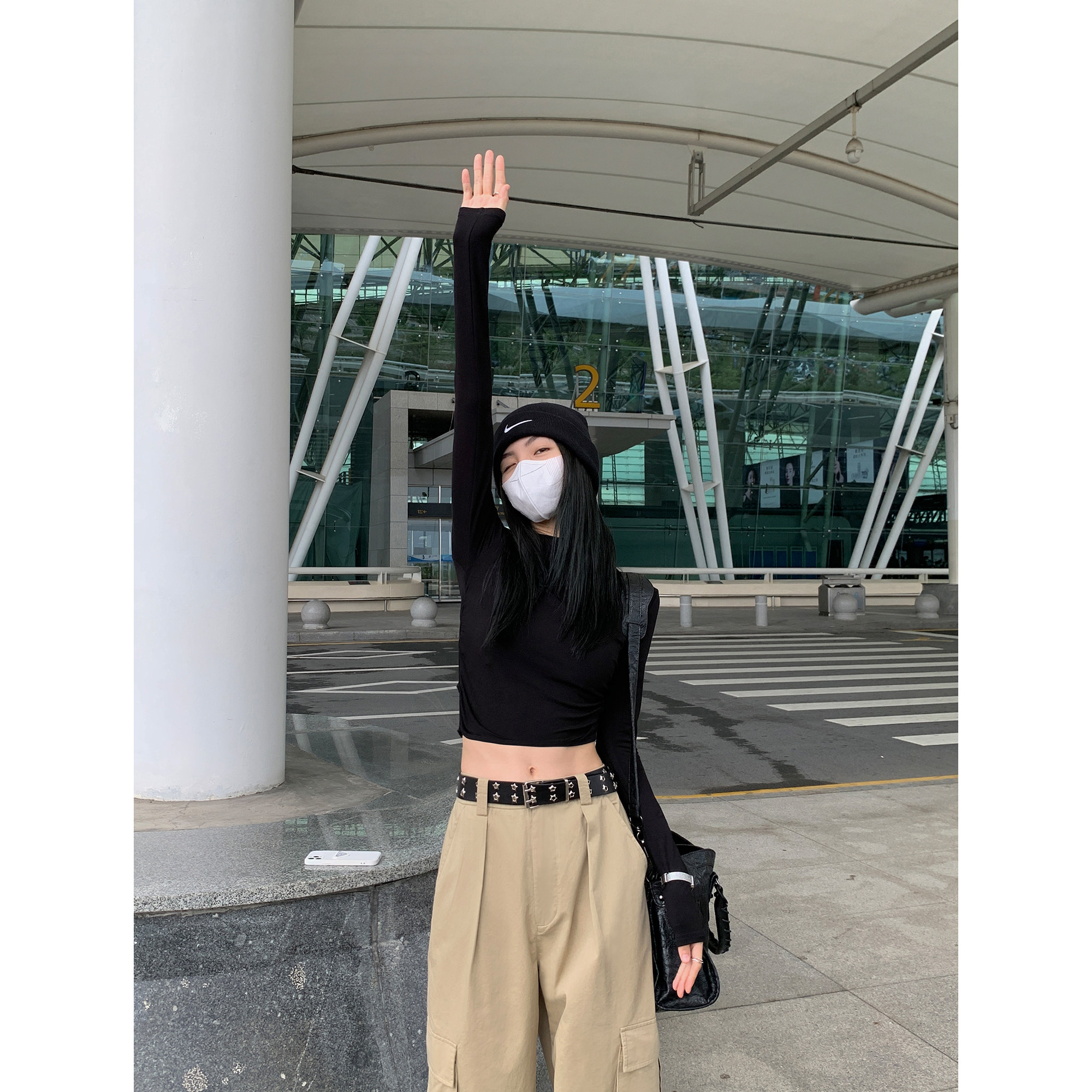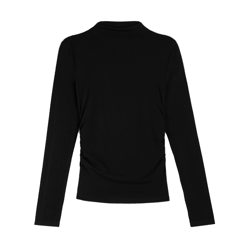 MULVAN 黑色半高领针织打底衫女秋冬长袖褶皱t恤修身显瘦内搭上衣