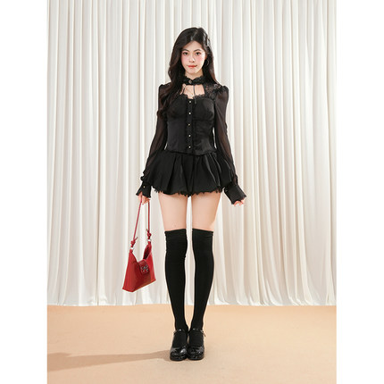 法式时尚洋气轻熟风套装女秋季新款蕾丝花边上衣黑色半身裙两件套