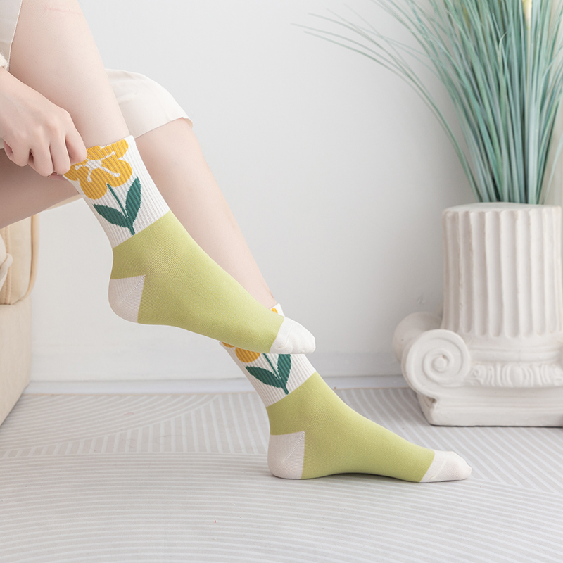 中筒袜子女棉袜中筒春秋款绿色小花ins潮流百搭学生学院风运动袜