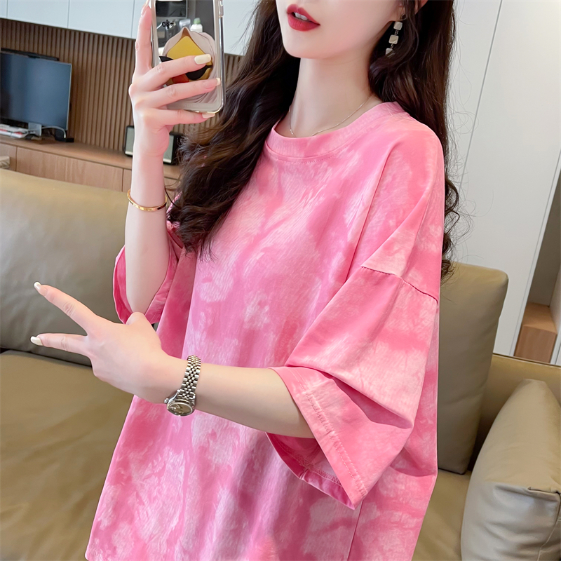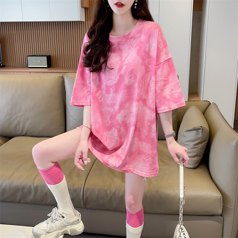 渐变色扎染短袖t恤女夏季韩版宽松大码女装中长款纯棉涂鸦上衣服