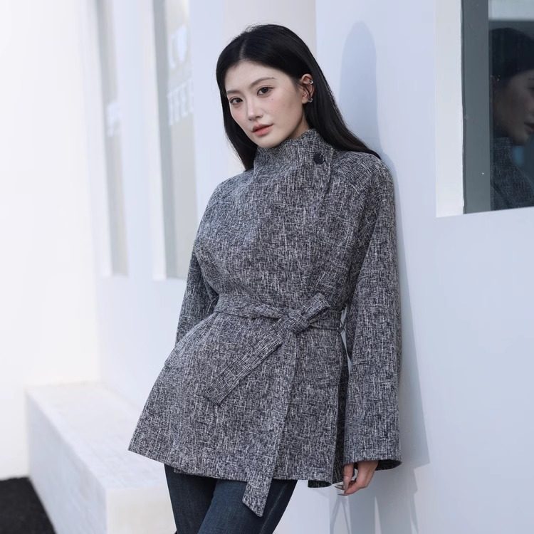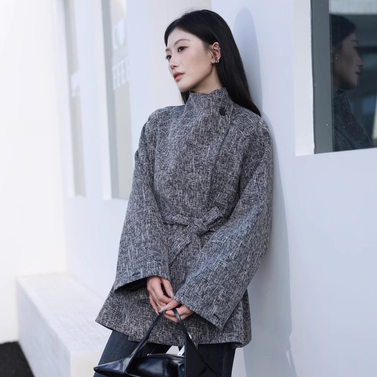 韩系百搭2025秋冬新款时尚洋气重工粗麻大翻领小个子短款风衣外套
