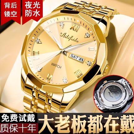 正品商沃多功能手表男士防水腕表 夜光男表全自动机械表 金色表