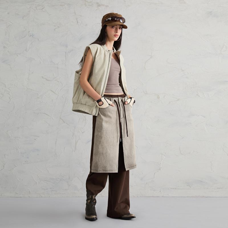 【明星同款】ORGANICEMOTION真两件针织裤双层腰头牛仔拼接休闲裤