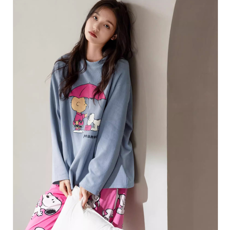 贝妍史努比睡衣女春秋新款圆领长袖套装可爱卡通大码柔软棉家居服