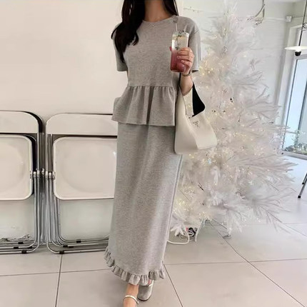 韩国chic夏季小众百搭荷叶边短袖T恤+高腰拼接木耳边半身裙套装女
