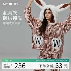 MYBODY商场同款冬季新款睡衣女可爱兔子连帽条纹珊瑚绒家居服套装