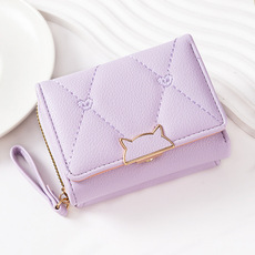 新款女士短款钱包小香风简约绣花爱心PU三折包多卡位零钱包手拿包