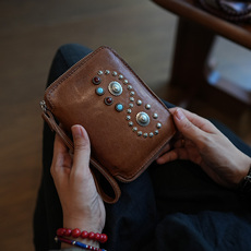 鹿小姐植鞣牛皮小众复古铆钉拉链大容量真皮证件收纳手拿钱包