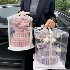 七夕情人节透明圆形蛋糕盒水晶有钱花抱抱桶PVC花束鲜花包装礼盒