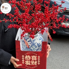 福字抱抱桶新年花桶冬青中国结挂银柳鲜花包装盒红色礼盒圆形花盒