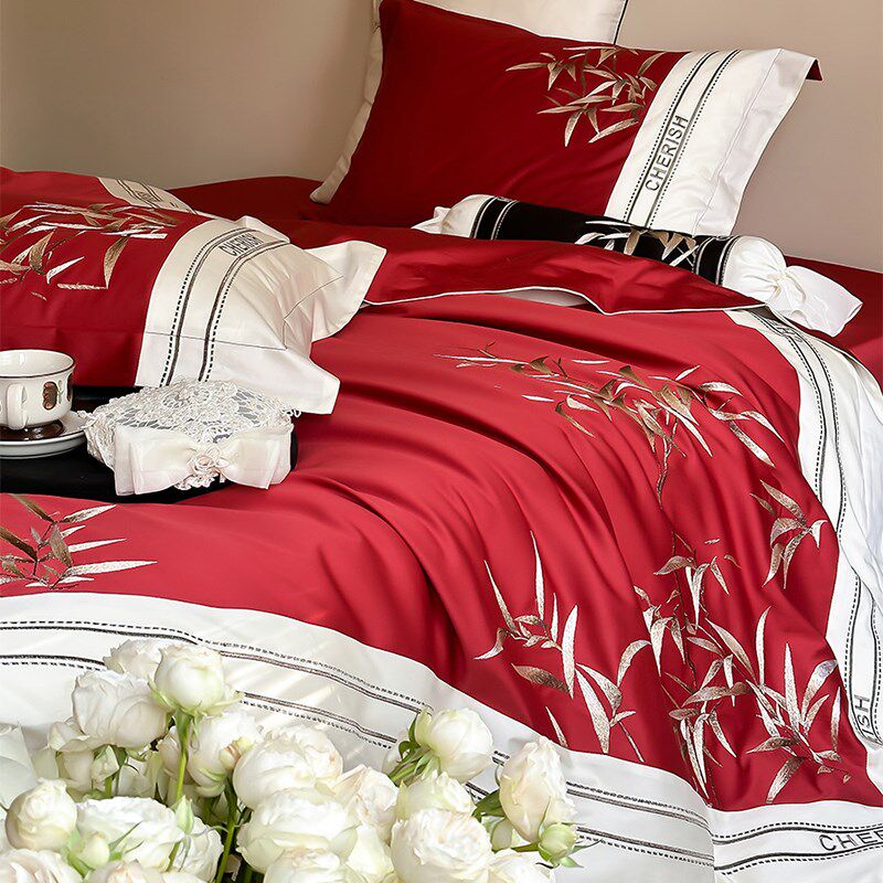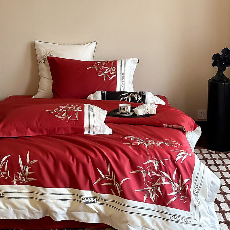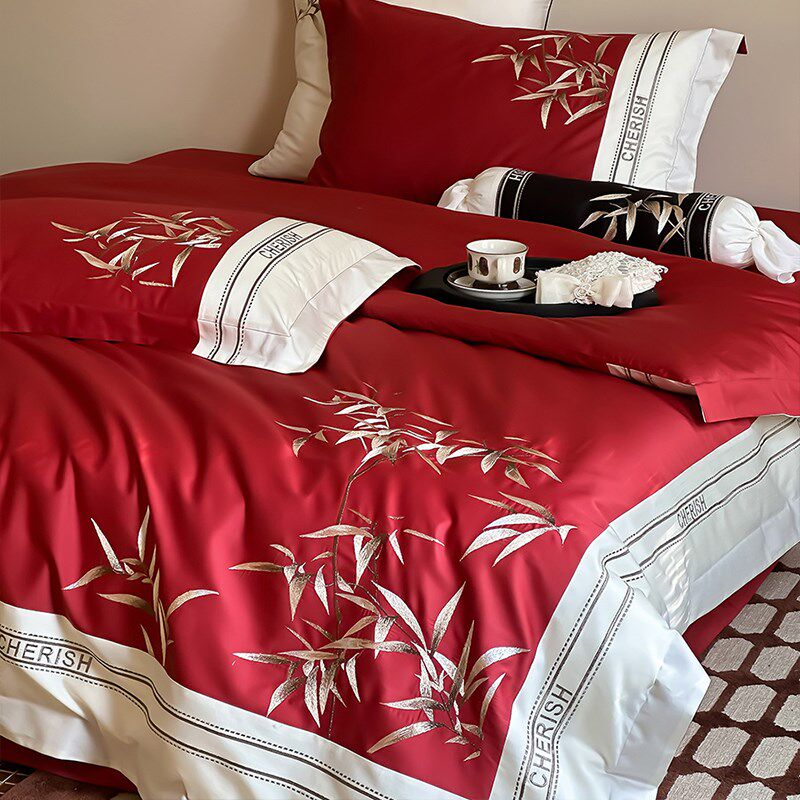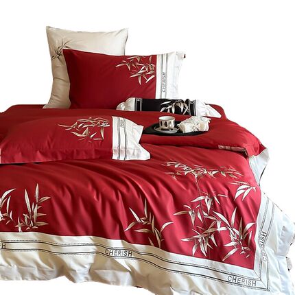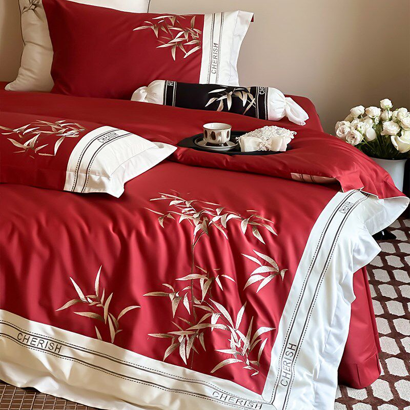 新中式国潮风竹子四件套结婚长绒棉婚庆全棉被套床单床上用品