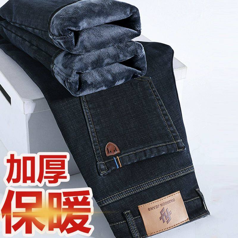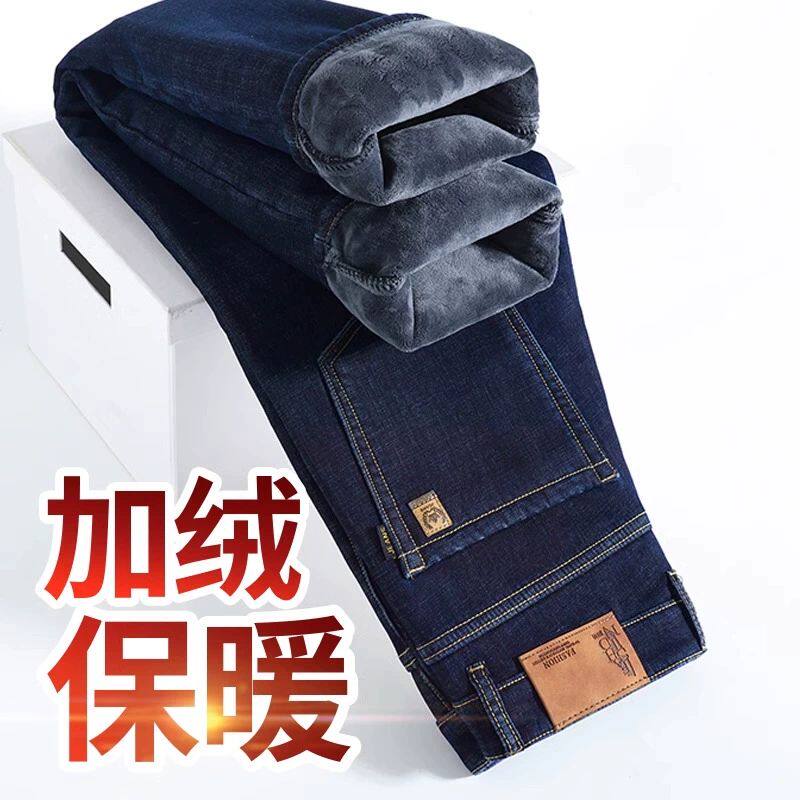 弹力牛仔裤男带绒直筒宽松加绒厚款中年棉裤高腰修身斜插袋男裤子