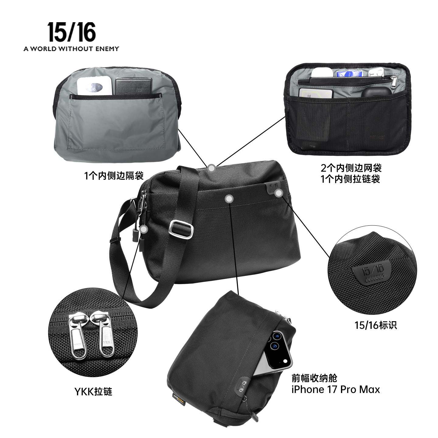Fifteen Sixteen弹道尼龙6L胸包户外腰包随身便携简约斜挎小包男