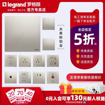 罗格朗开关插座面板一开五孔二三插usb未莱金色86型电源16A空调插