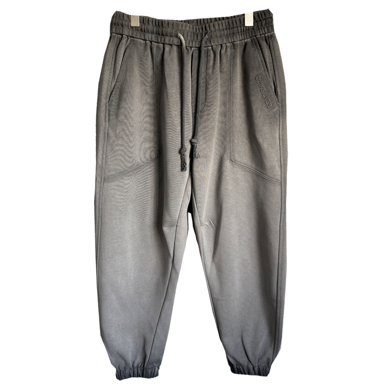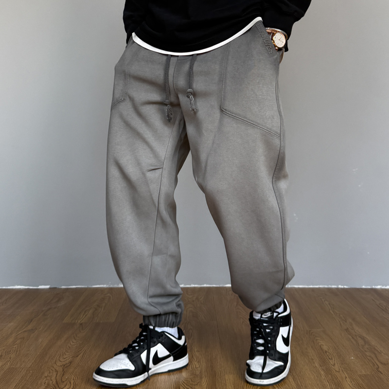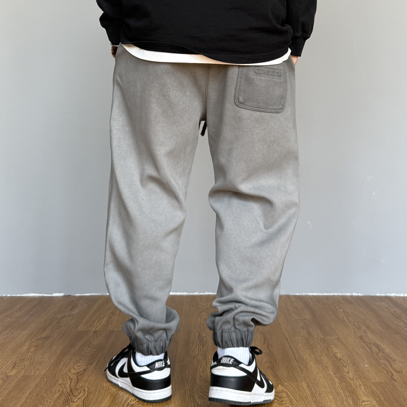 春季美式休闲痞帅重磅复古做旧脏洗工业灰卫裤男宽松抽绳束脚裤子