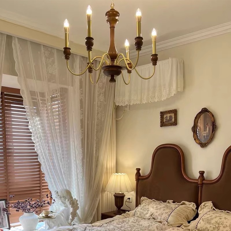 美式全铜客厅吊灯复古蜡烛灯大厅主灯实木法式中古风餐厅卧室灯具