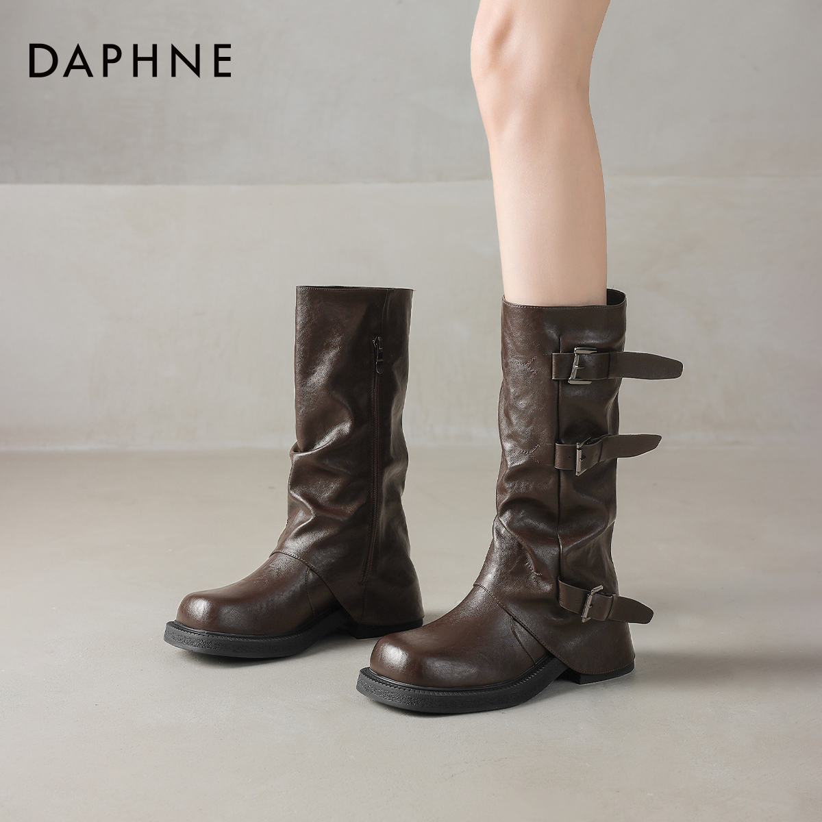 达芙妮棕色中筒裤管靴女美拉德靴