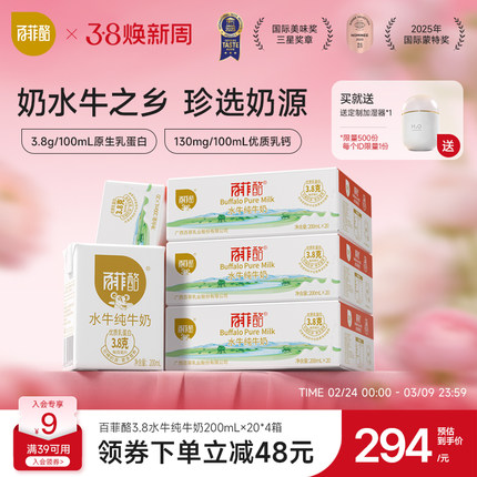百菲酪水牛纯牛奶200ml*20盒*4箱囤货装家庭装儿童营养早餐奶