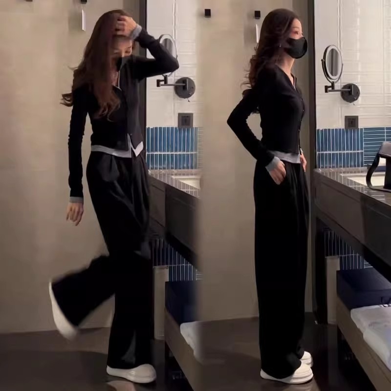 时尚休闲运动套装女2025秋季新款假两件长袖上衣阔腿裤显瘦两件套