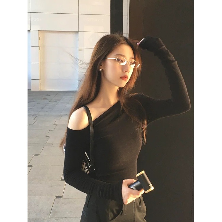 辣妹黑色一字露肩斜肩长袖t恤女2025秋季新款修身显瘦纯欲风上衣