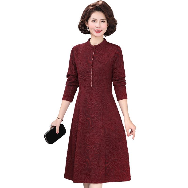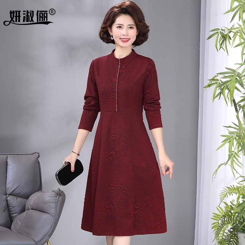 中老年女装喜庆婚宴2024新款妈妈结婚酒红连衣裙立领秋冬打底裙子