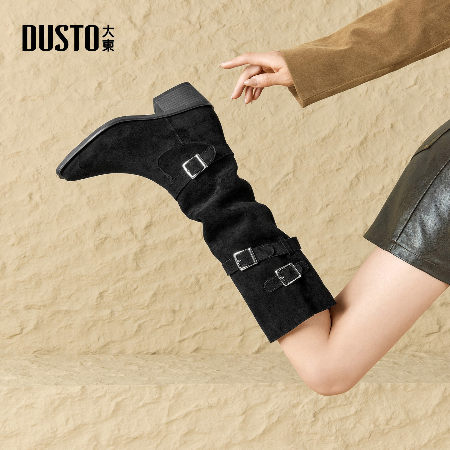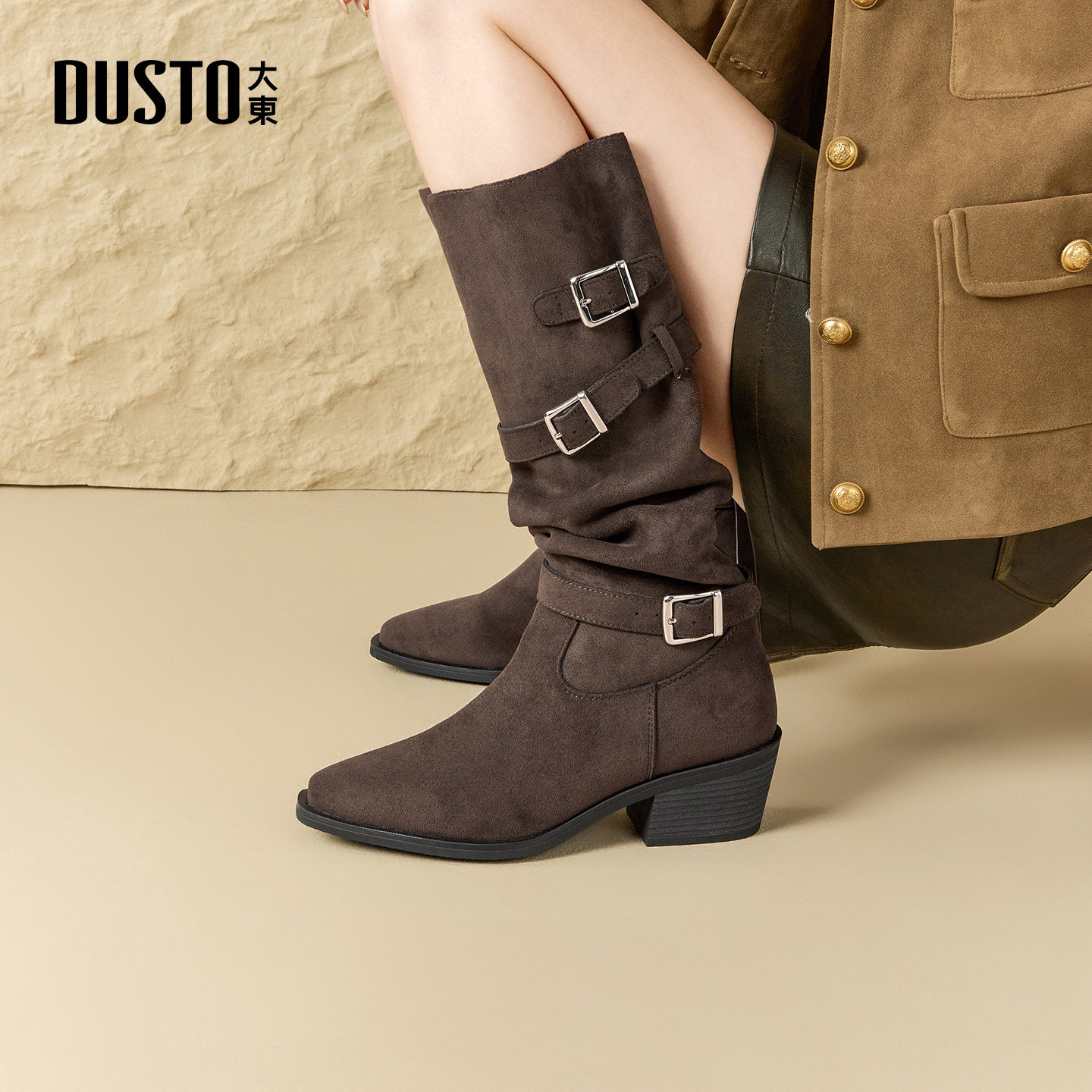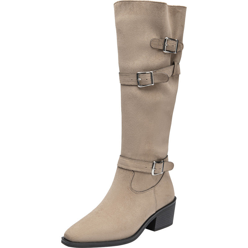 大东复古皮带扣粗跟长筒靴女2025新款秋冬靴子尖头褶皱西部堆堆靴