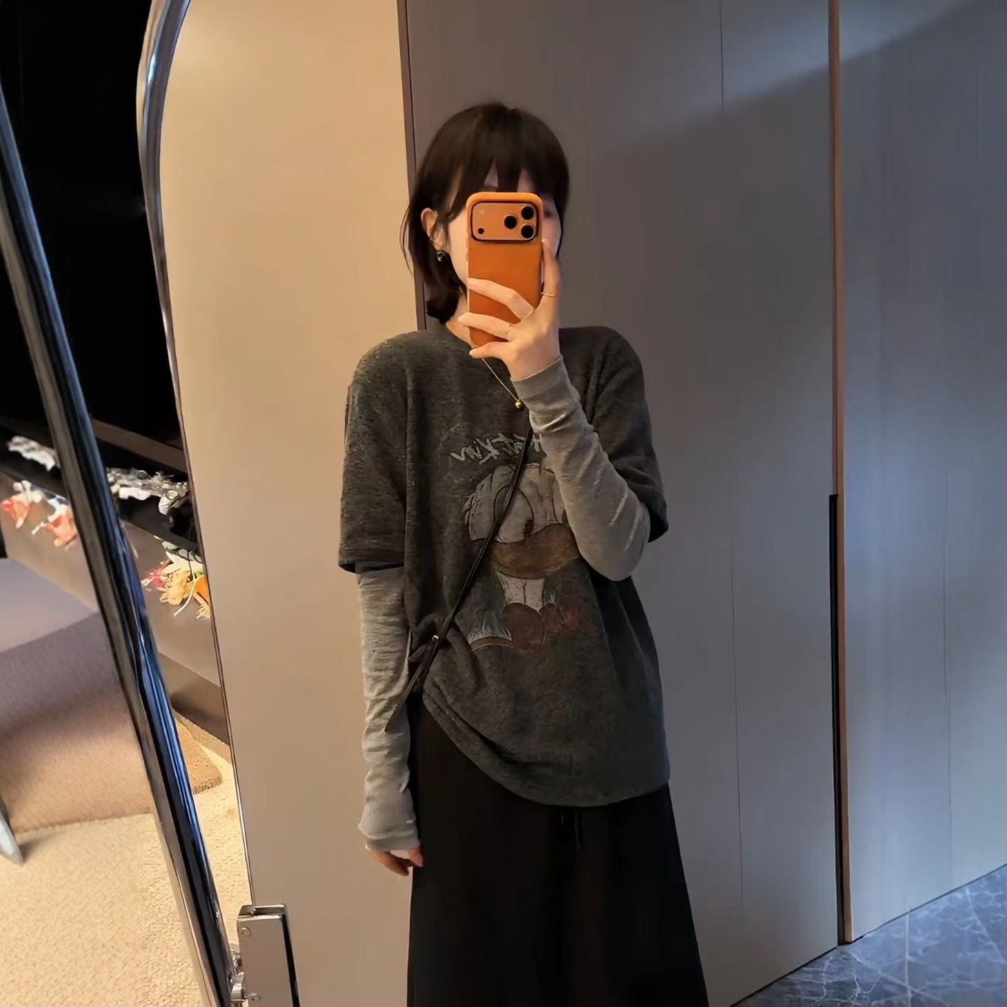 印花唐老鸭圆领假两件长袖t恤女2025新款秋季欧洲站宽松气质上衣
