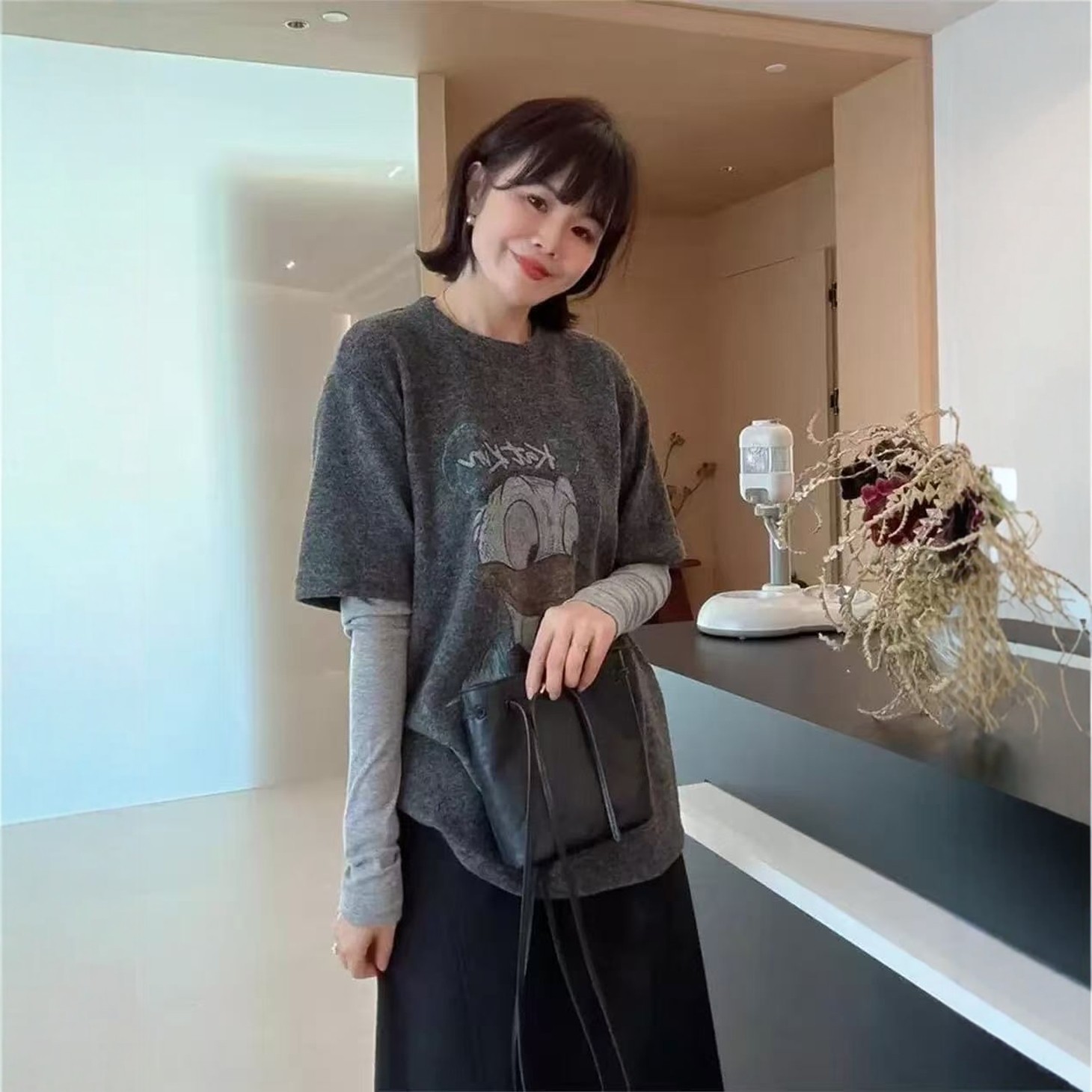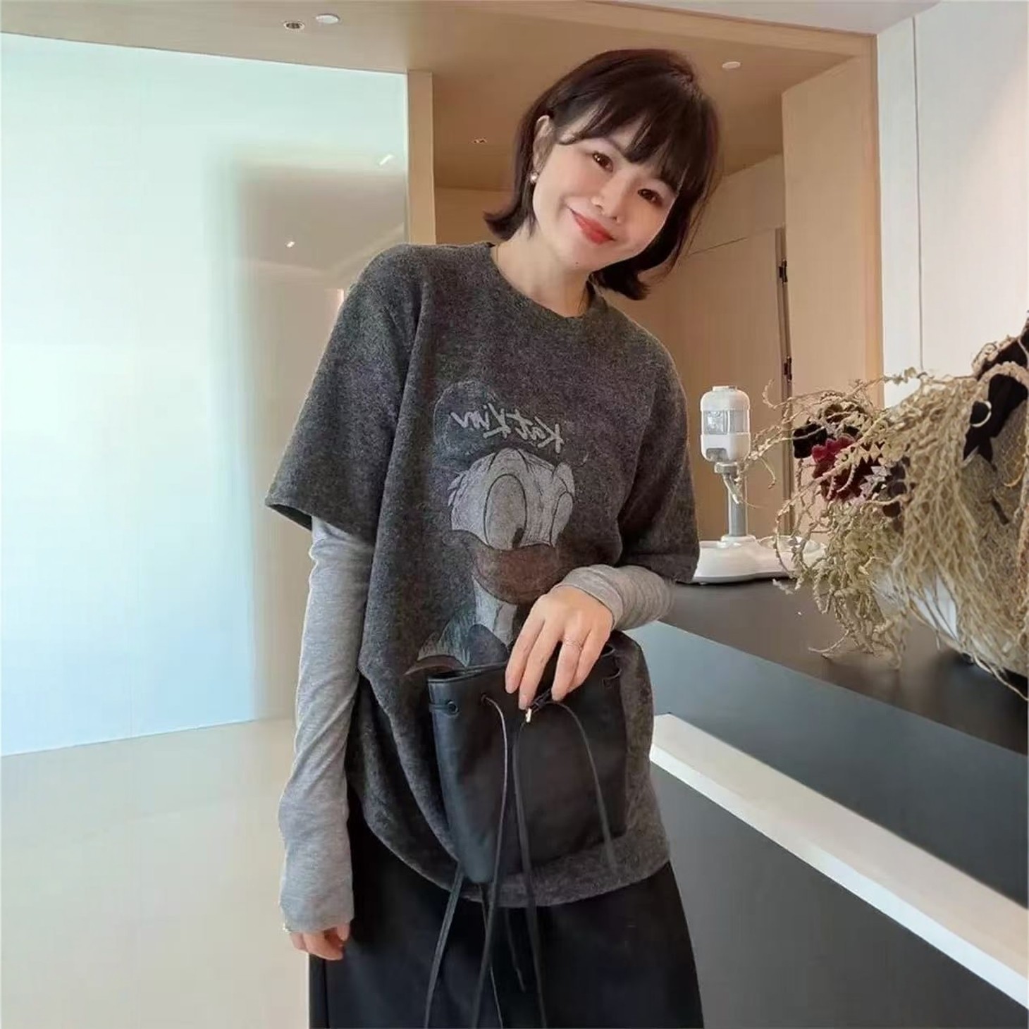 印花唐老鸭圆领假两件长袖t恤女