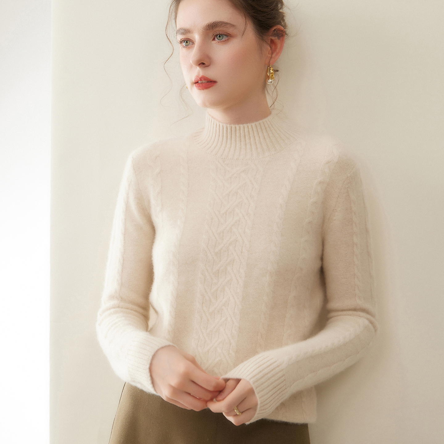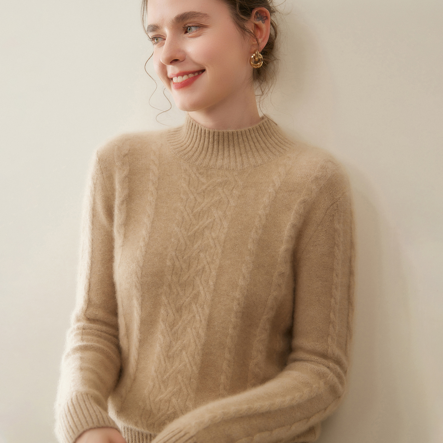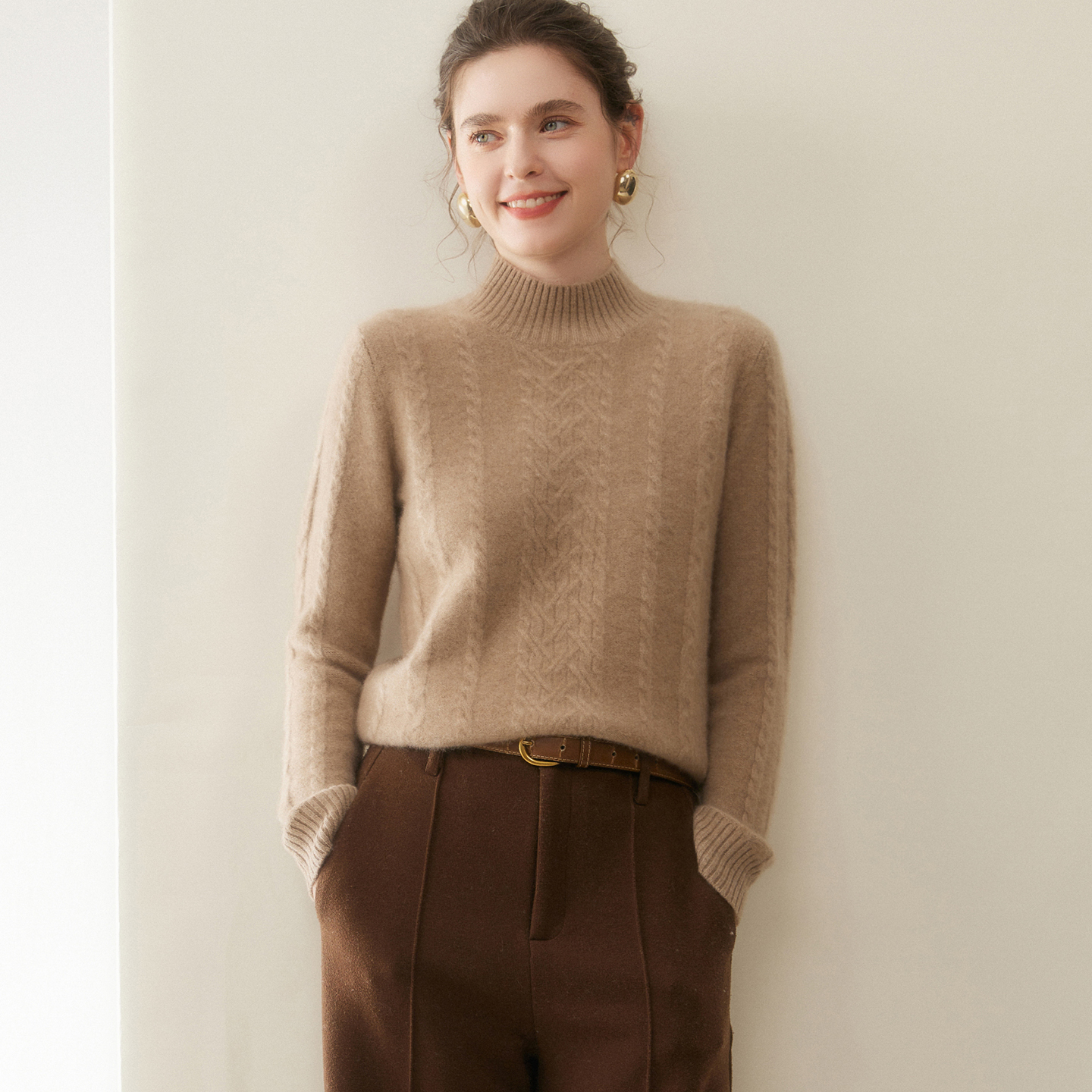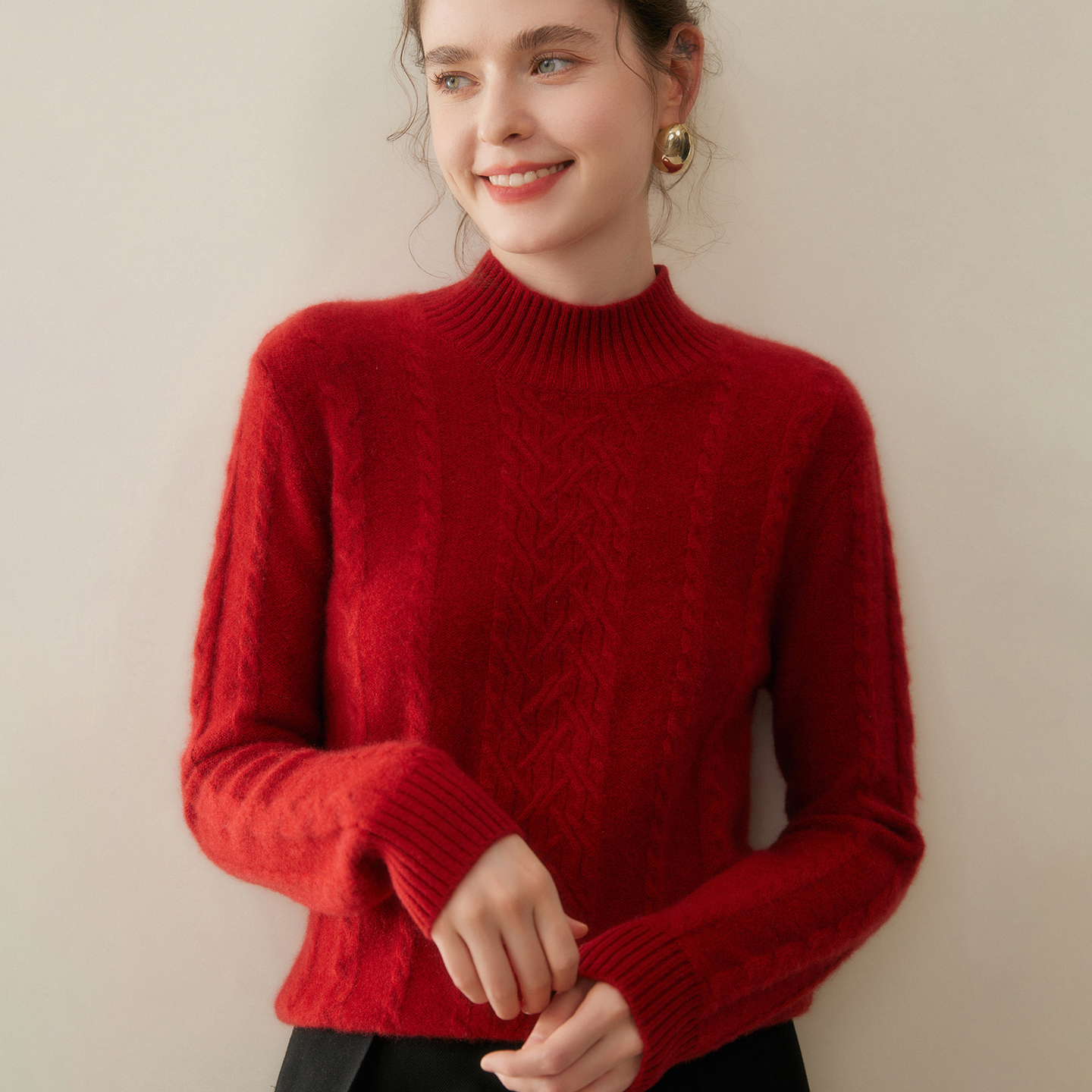 红莲高端轻奢山羊绒衫女半高领加厚绞花针织衫宽松显瘦纯色打底衫
