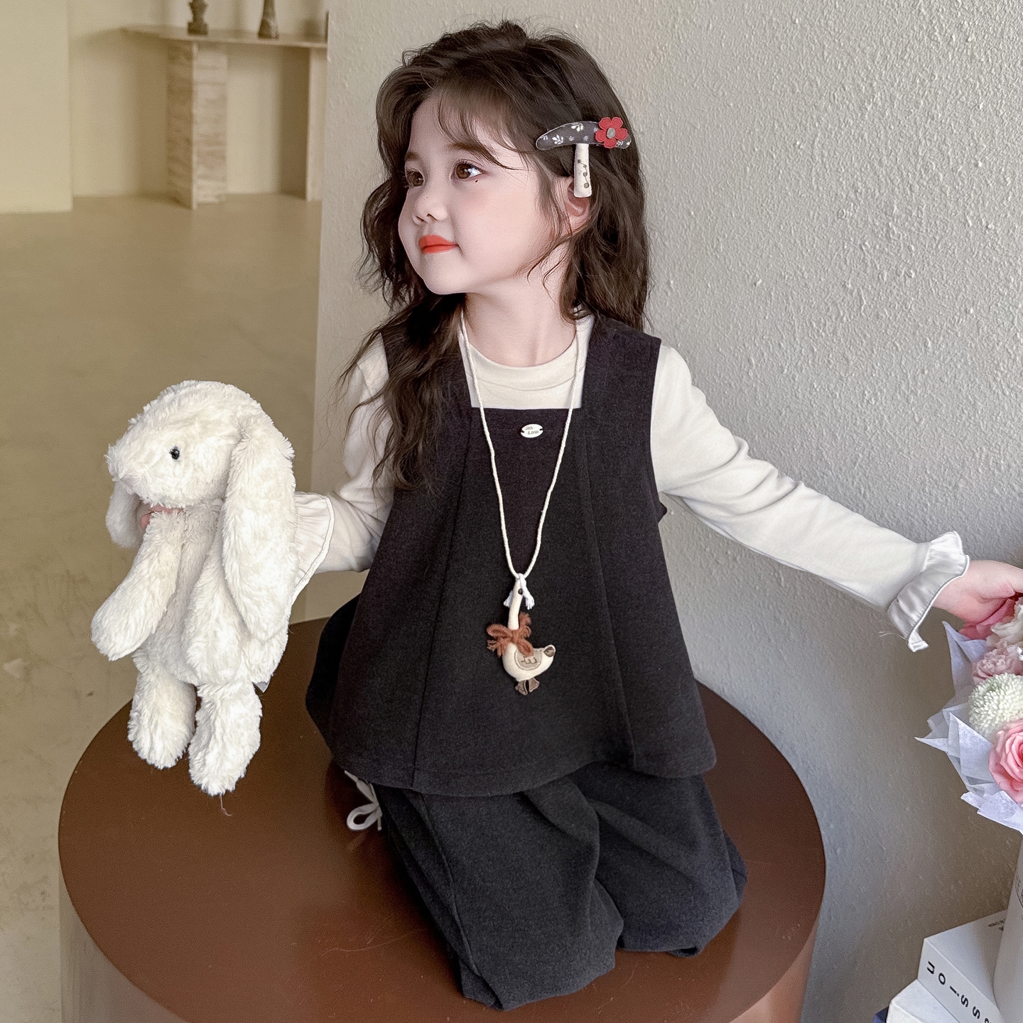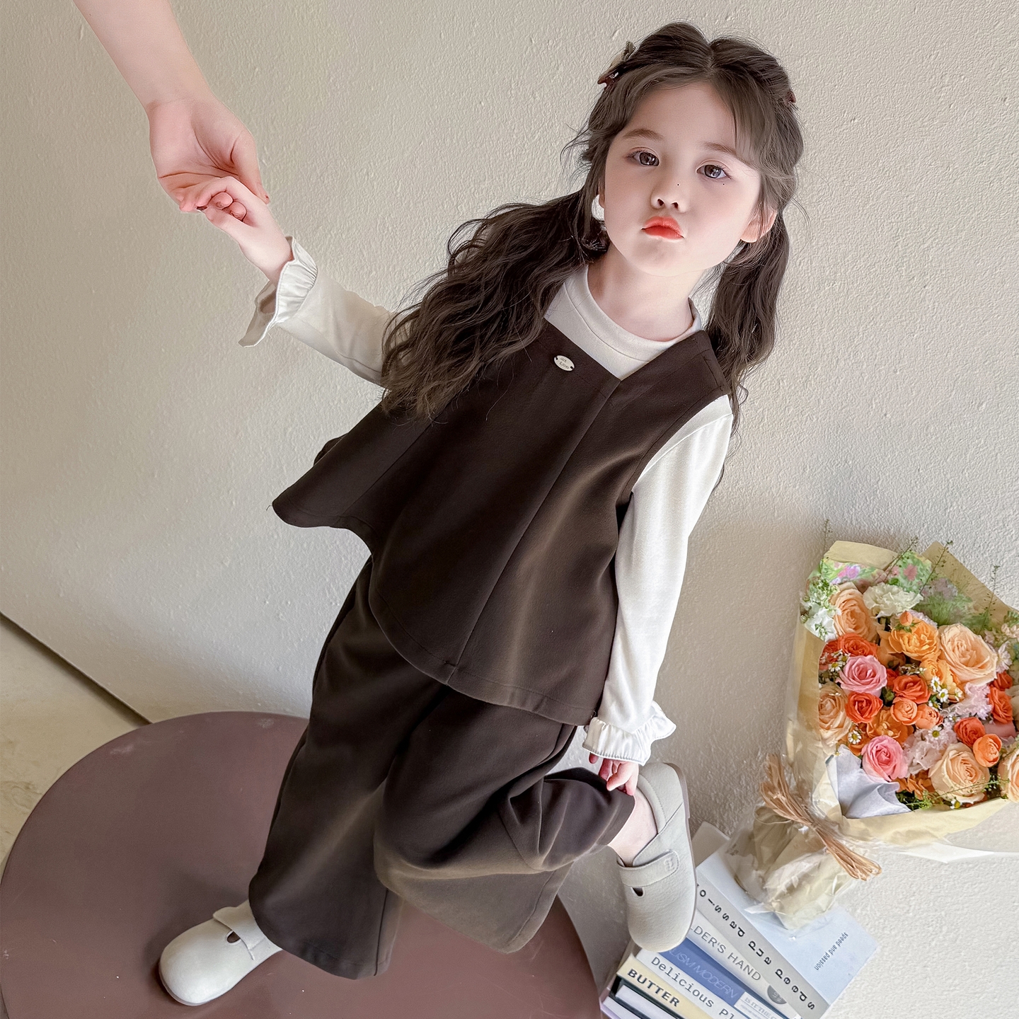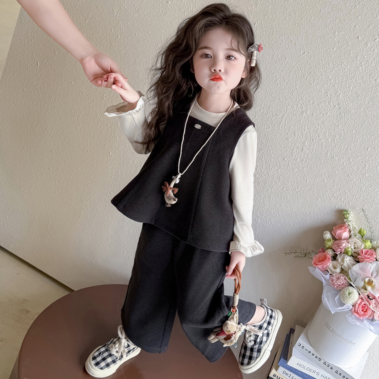 女童套装2025新款儿童春秋季长袖荷叶袖背心阔腿裤休闲时髦三件套