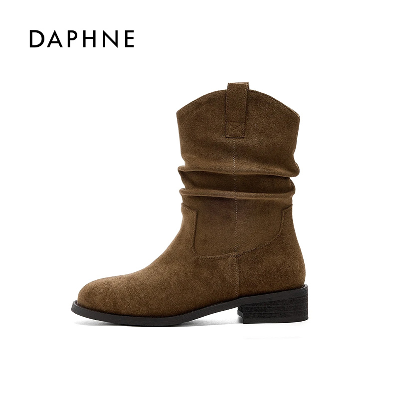 达芙妮复古加绒褶皱靴子女款2025新款秋冬粗跟时尚西部瘦瘦堆堆靴