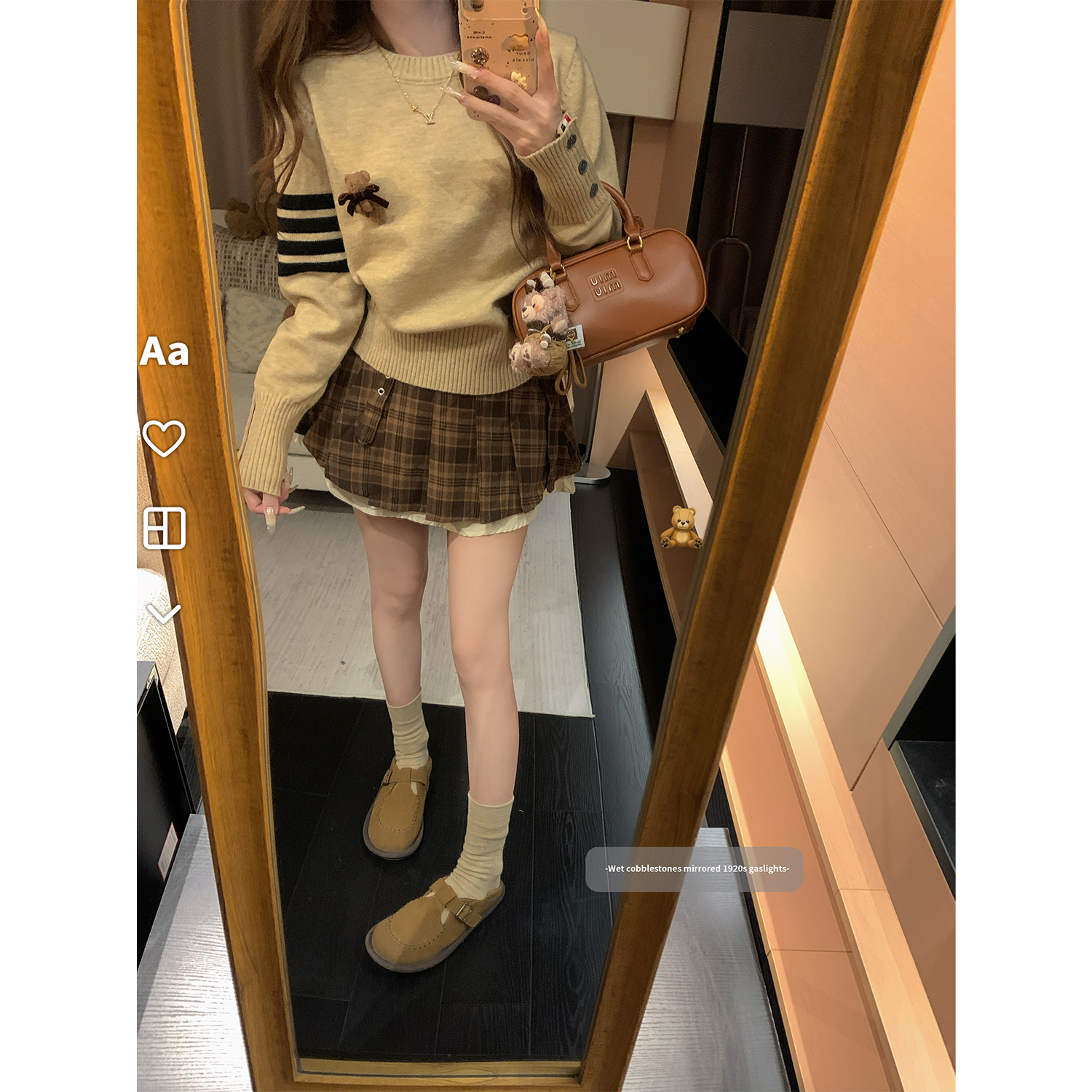 DDXZ夕子 美式复古防走光A字短款百褶裙性感纯欲风棕色格子半身裙