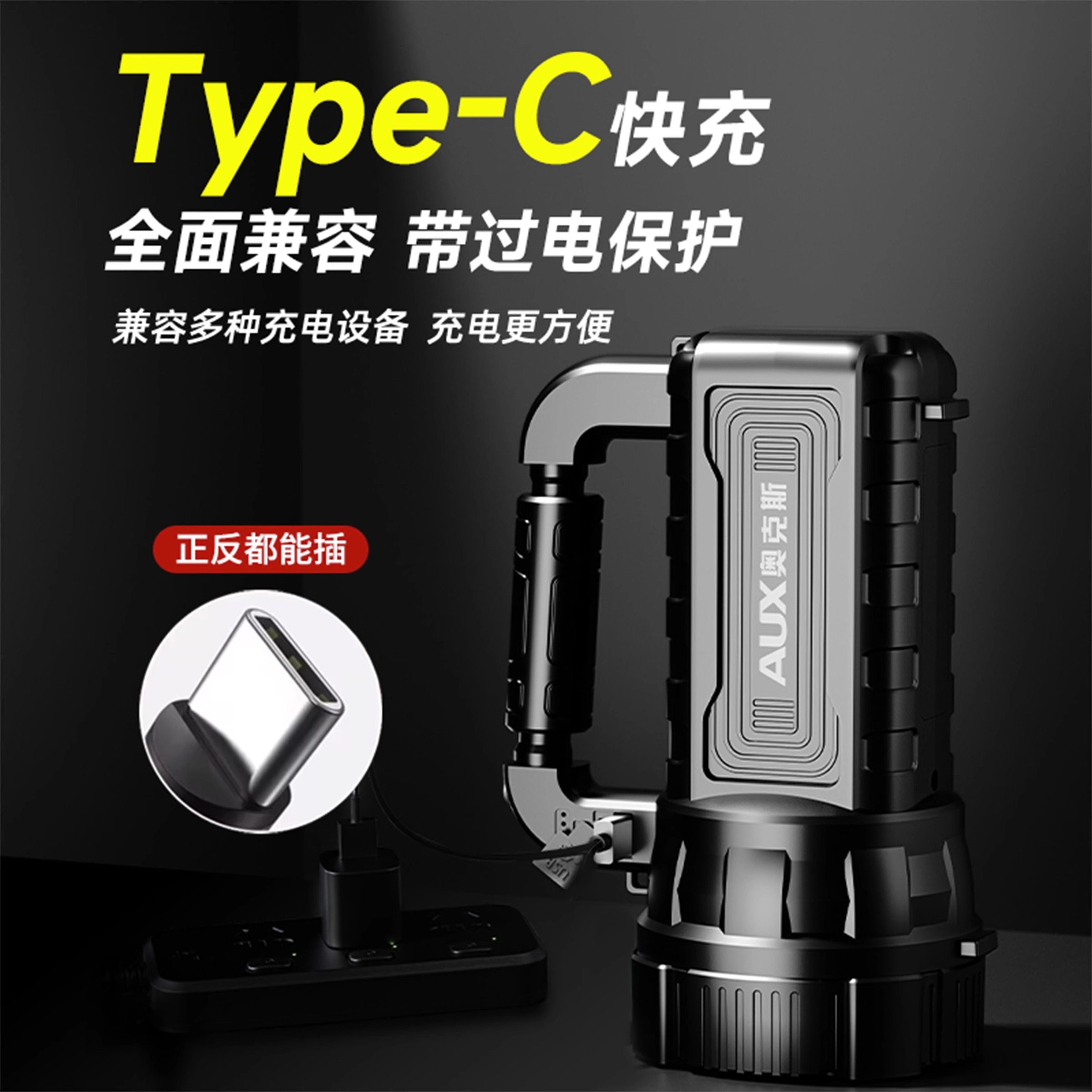 奥克斯手电筒强光充电太阳能超亮远射户外家用应急探照手提工作灯