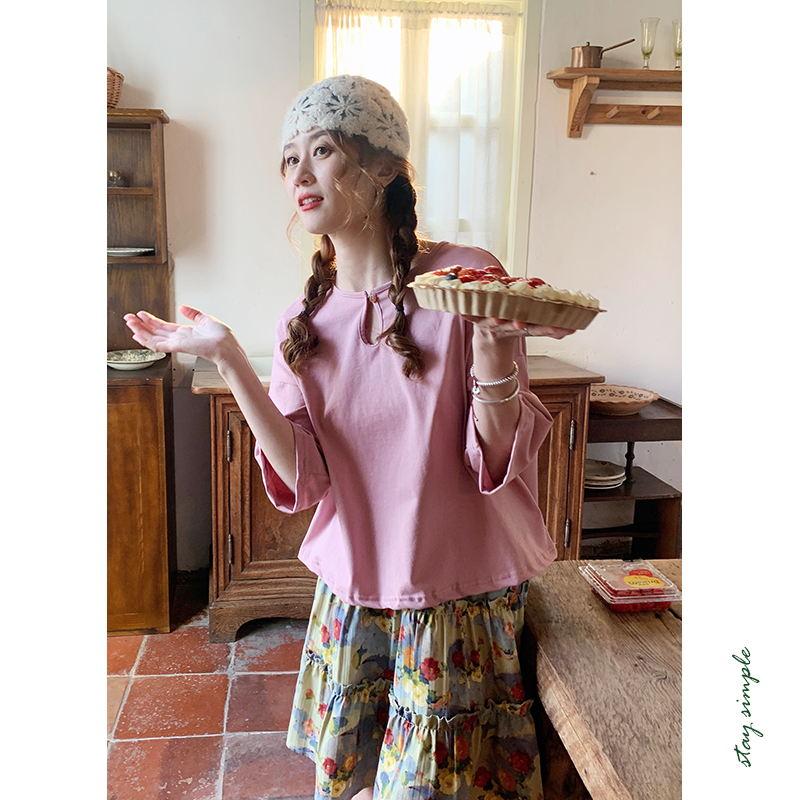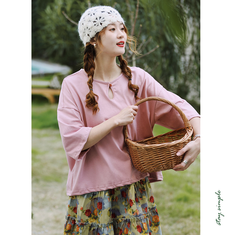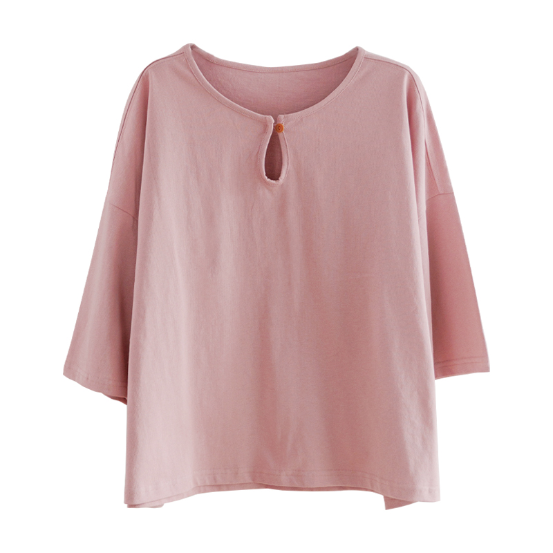 花吉B926杏色水滴领撞色扣宽松七分袖T恤女2025新款春上衣
