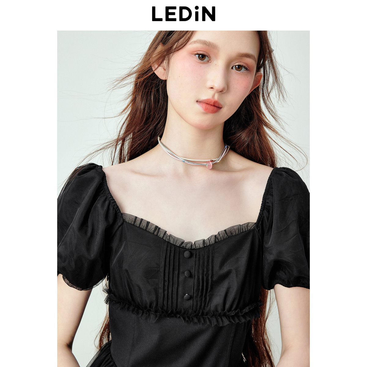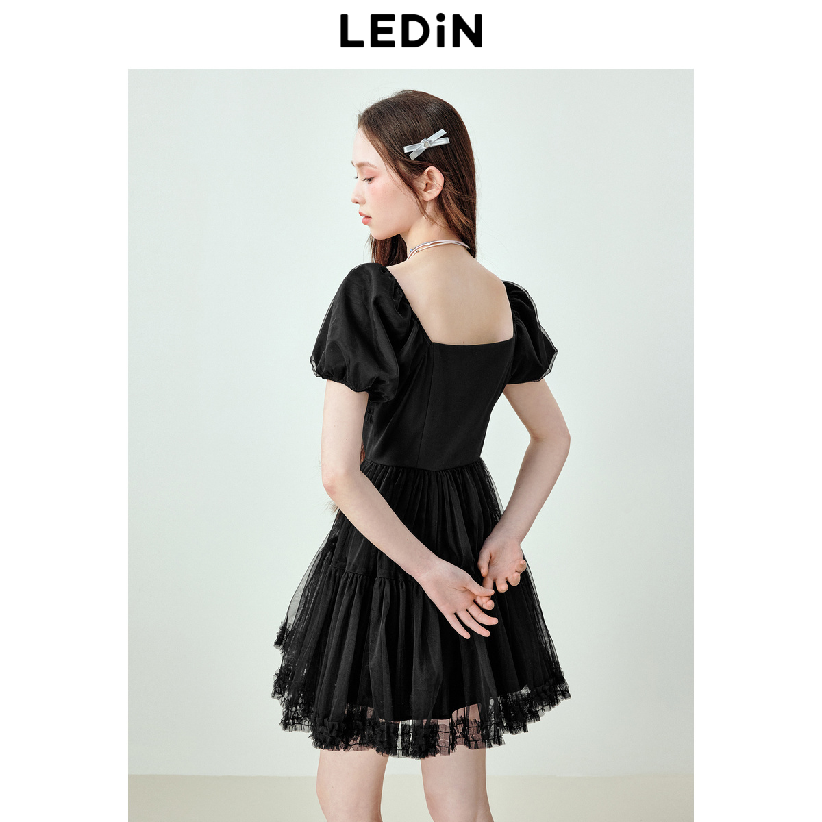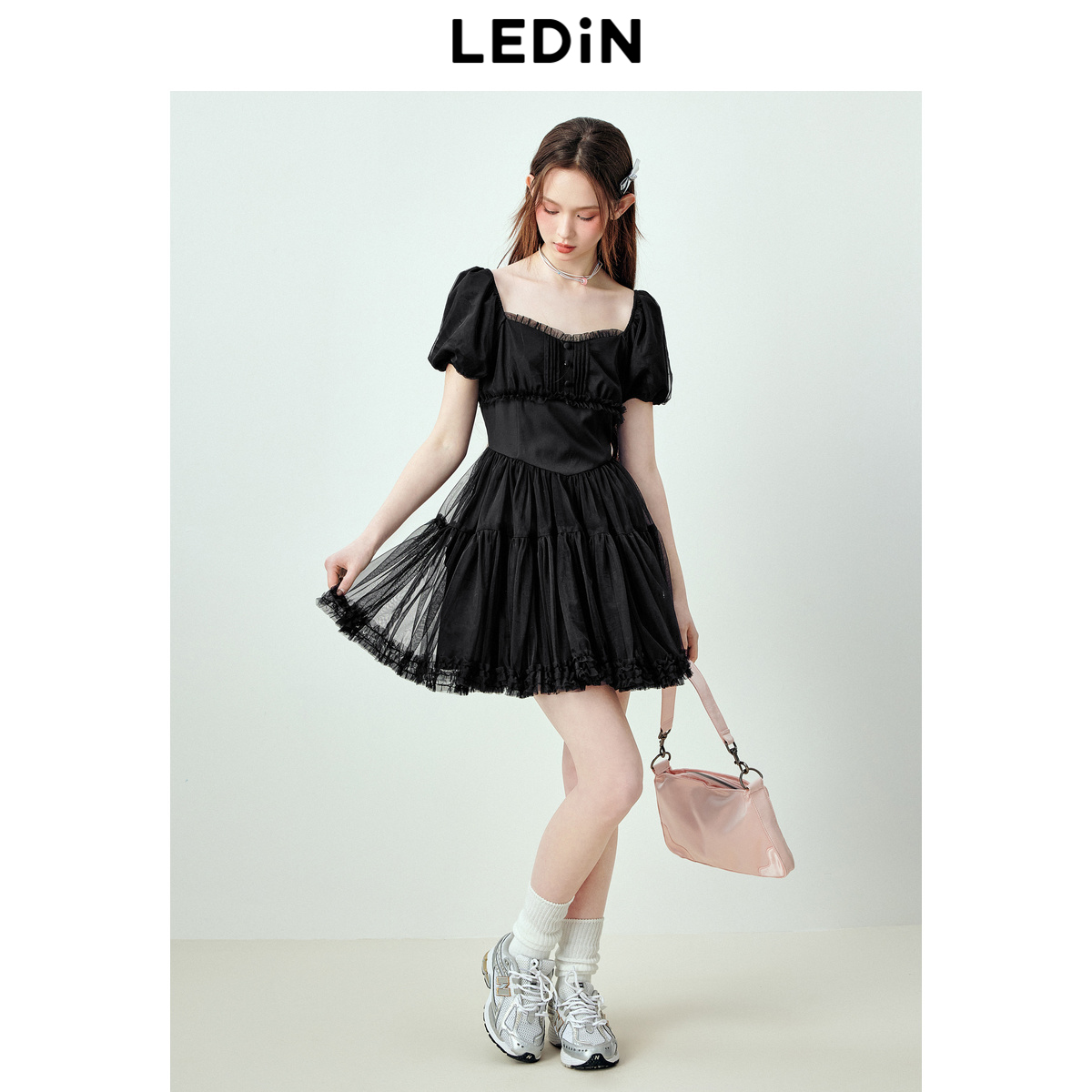 乐町网纱拼接连衣裙夏季新款温柔法式小礼服裙黑色约会蓬蓬裙