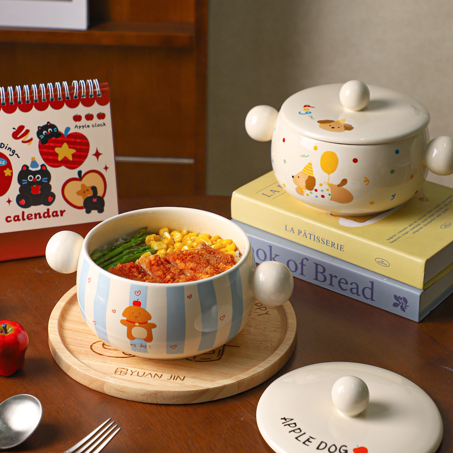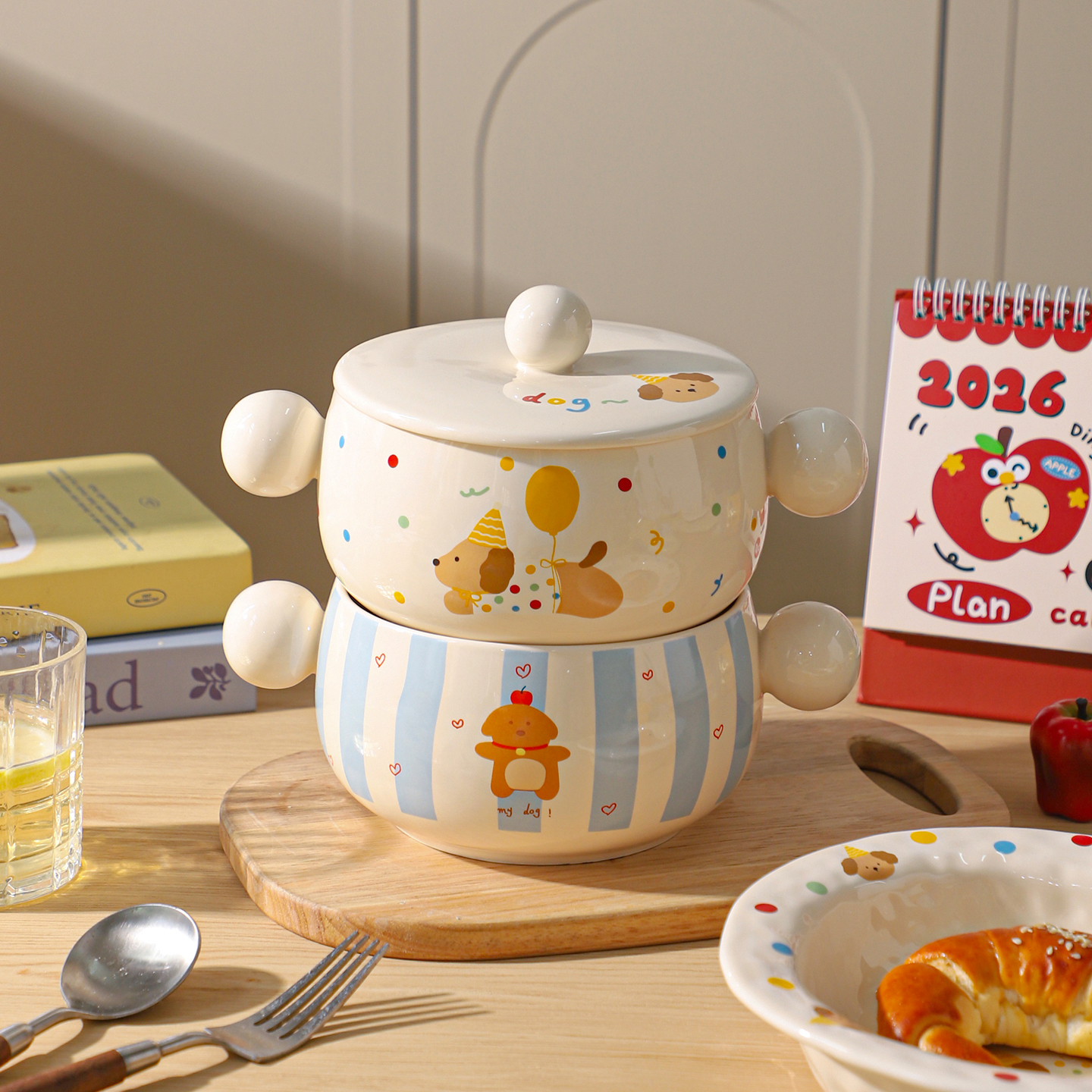 舍里可爱陶瓷圆珠双耳带盖泡面碗隔热防烫学生专用碗食堂打饭碗