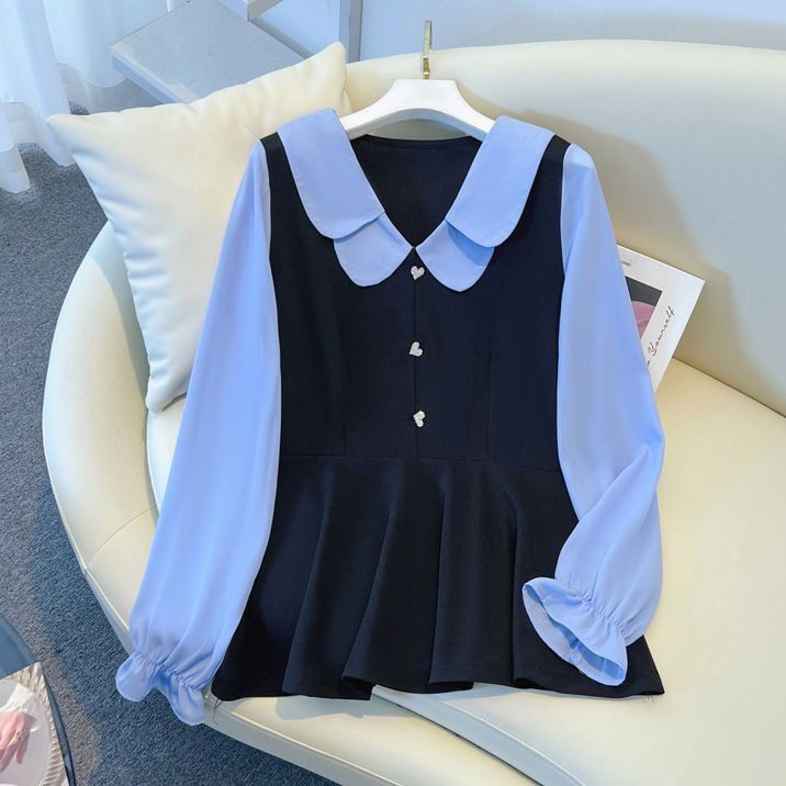 撞色拼接长袖衬衫2025春款洋气上衣假两件显瘦遮肉胖MM大码女装