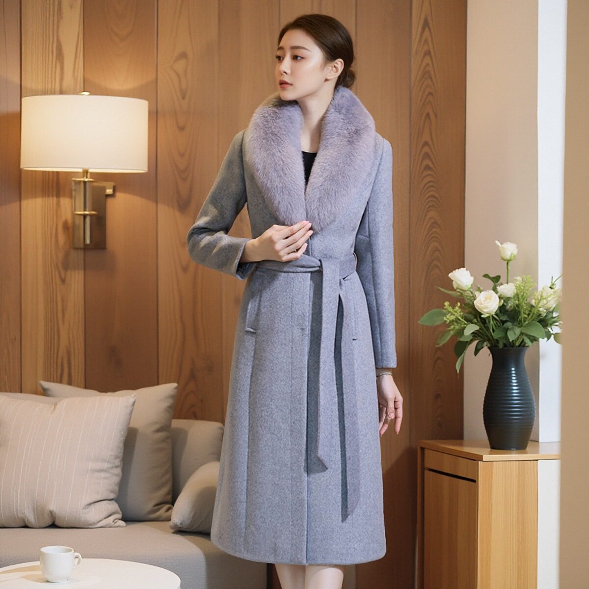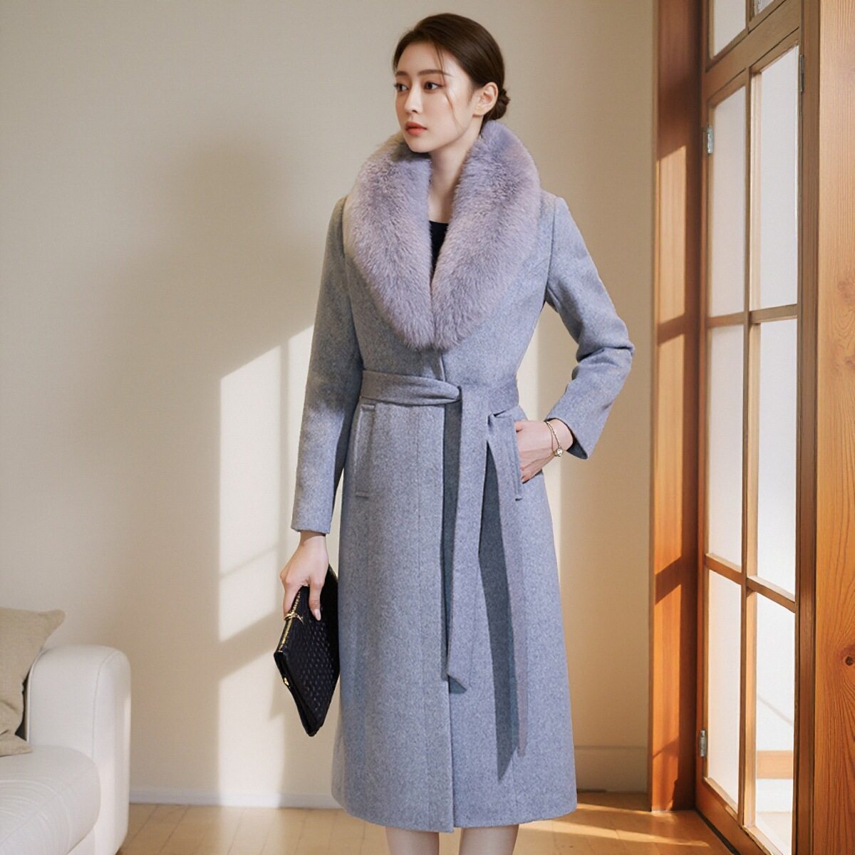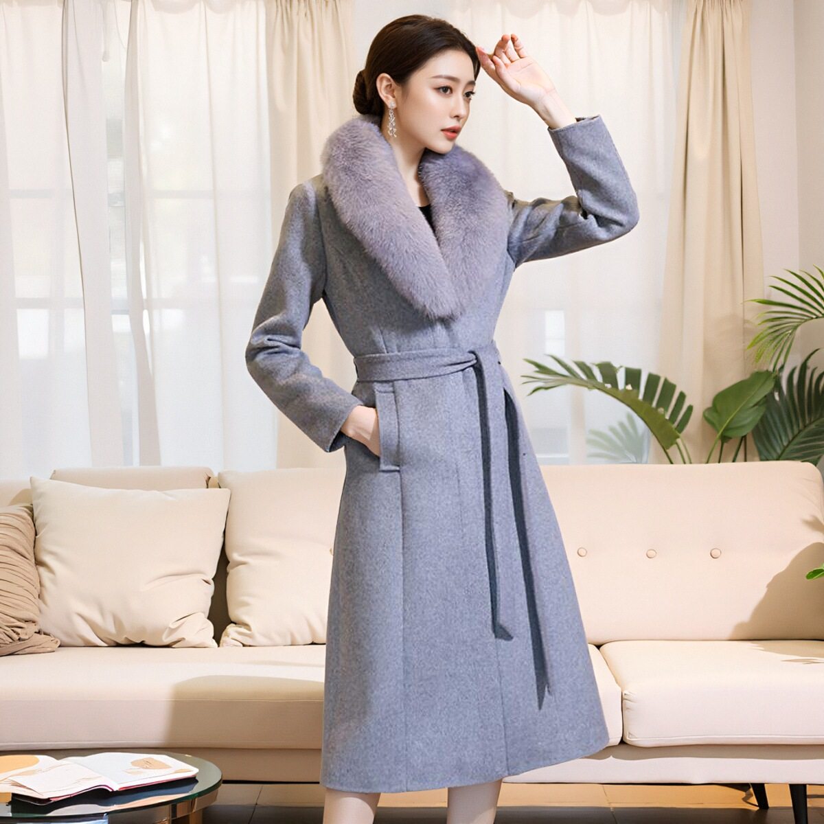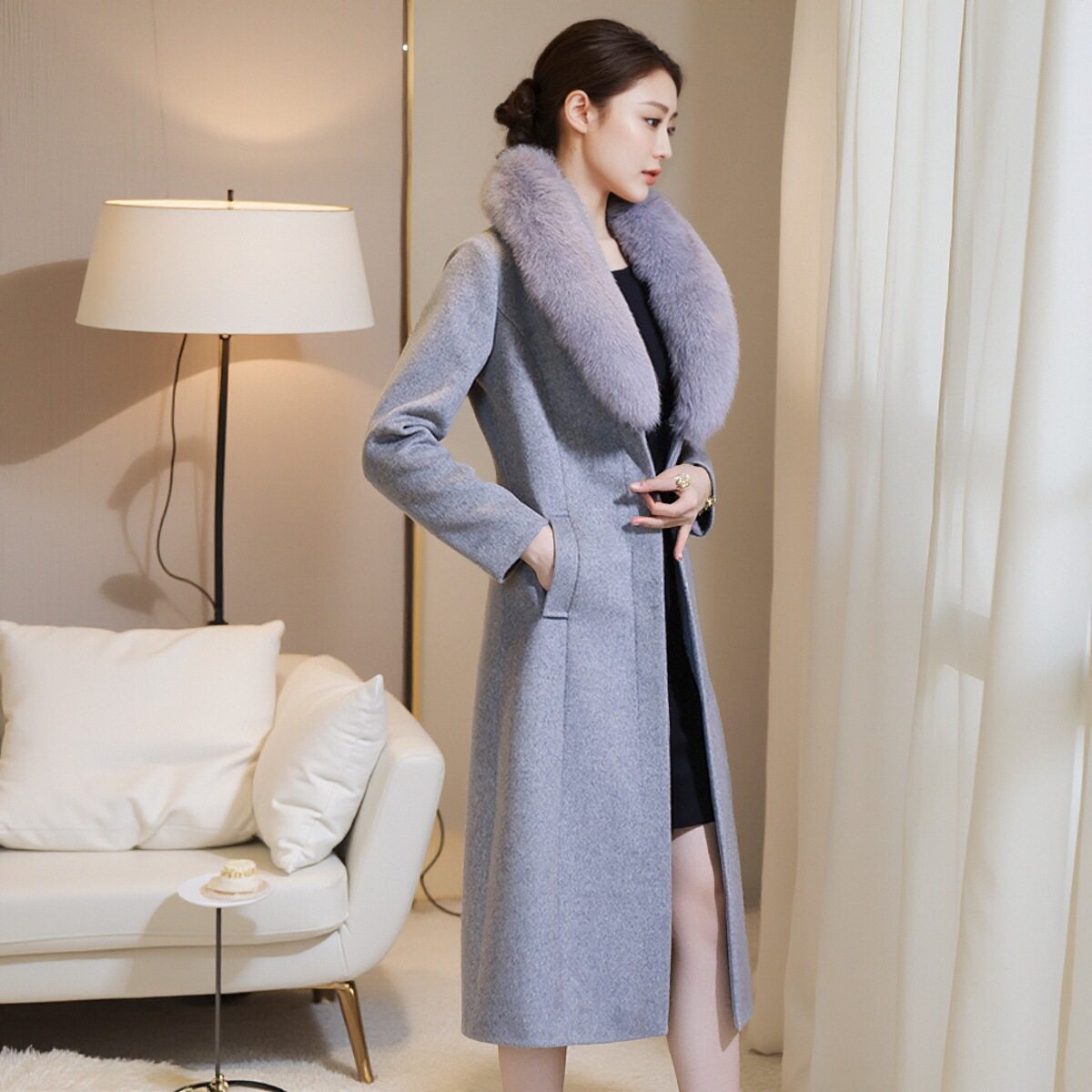 秋冬新款狐狸毛领羊绒大衣女中长款加厚高端妈妈修身长款毛呢外套