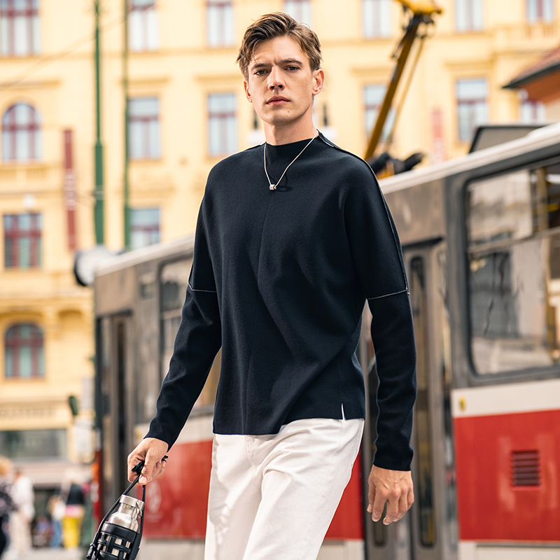 MrBu布先生时尚撞色线条100%羊毛毛衣秋冬半高领羊毛衫男PT15580