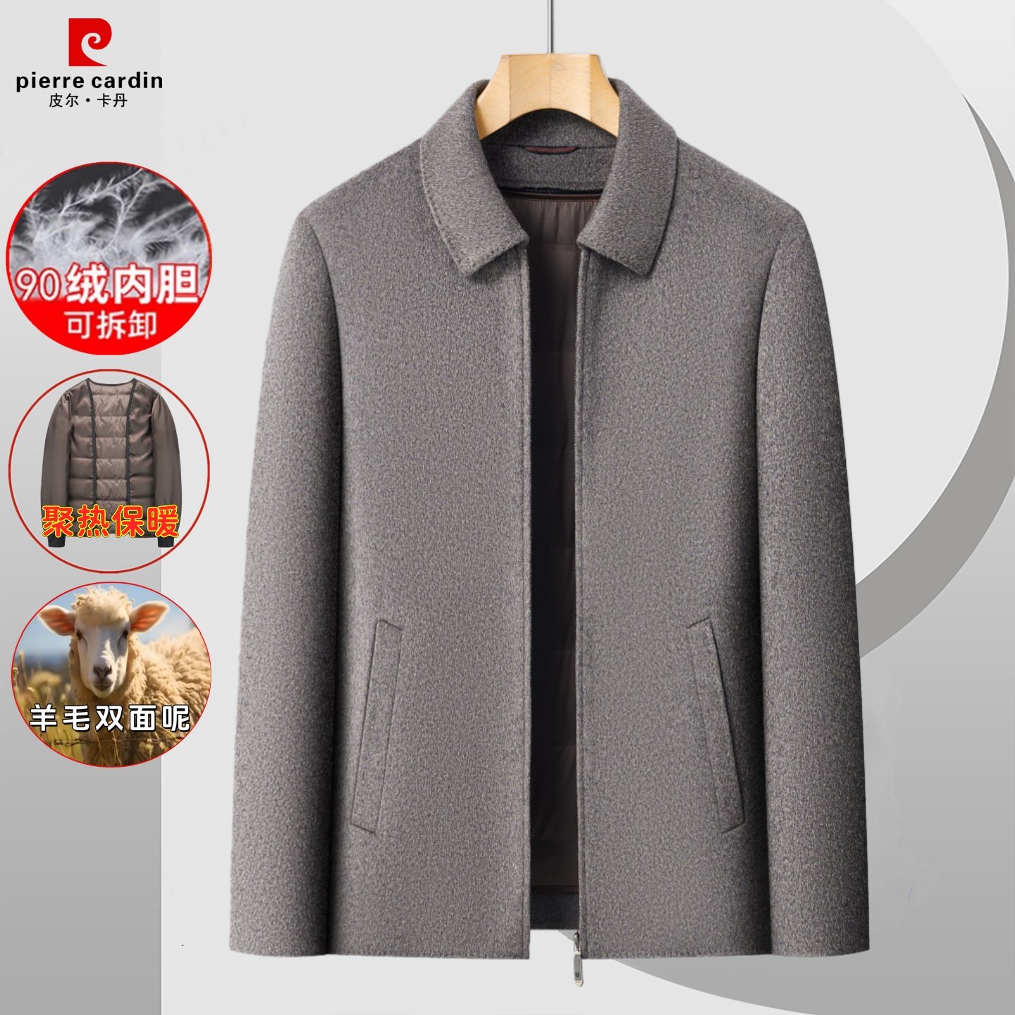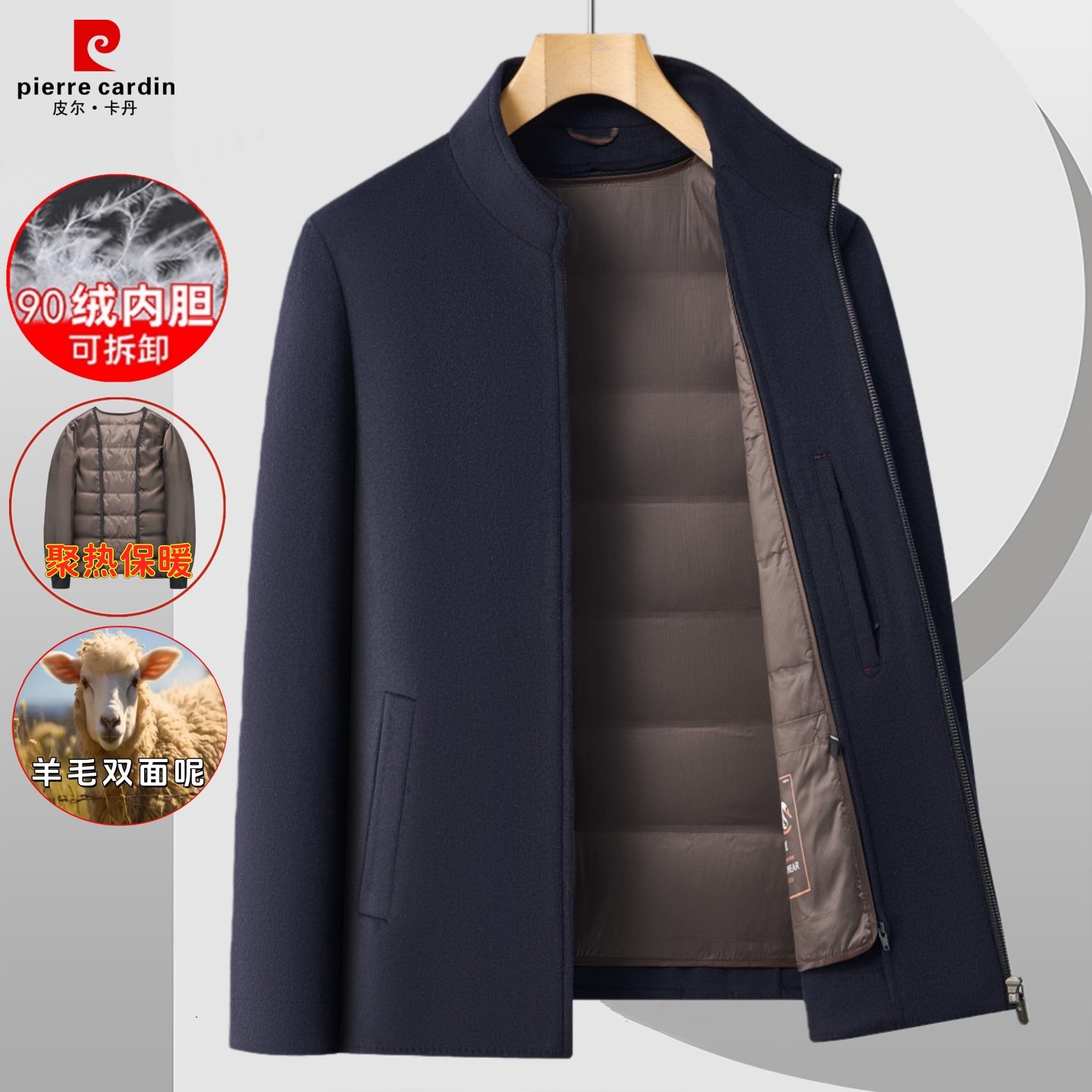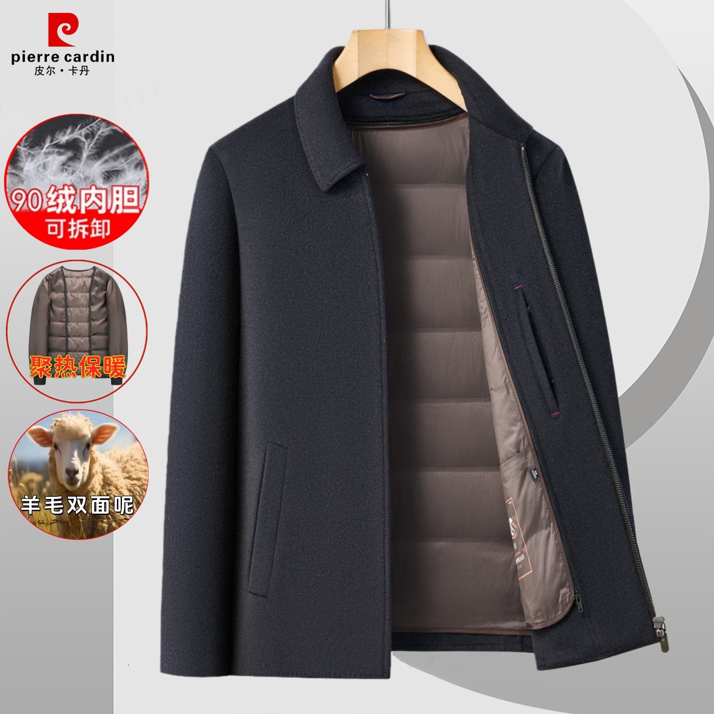 皮尔卡丹双面羊毛呢加厚保暖可拆鹅绒内胆男外套冬季中老年爸爸装