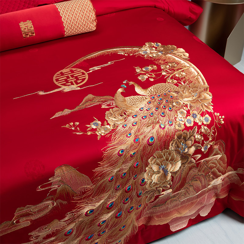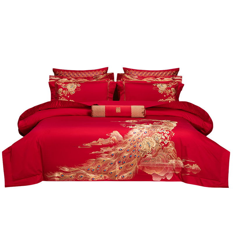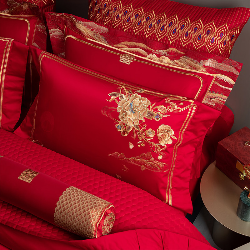 新中式婚庆牀上用品四件套大y红色牀单刺绣喜庆被套结婚十件套